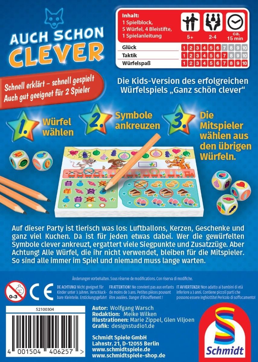 Schmidt Spiele 40625 Auch schon Clever Auf dieser Party ist tierisch was los: Luftballons, Kerzen, Geschenke und ganz viel Kuchen. Da ist für jeden etwas dabei. Wer die gewürfelten Symbole clever ankreuzt, ergattert viele Siegpunkte und Zusatzzüge. Aber Achtun...