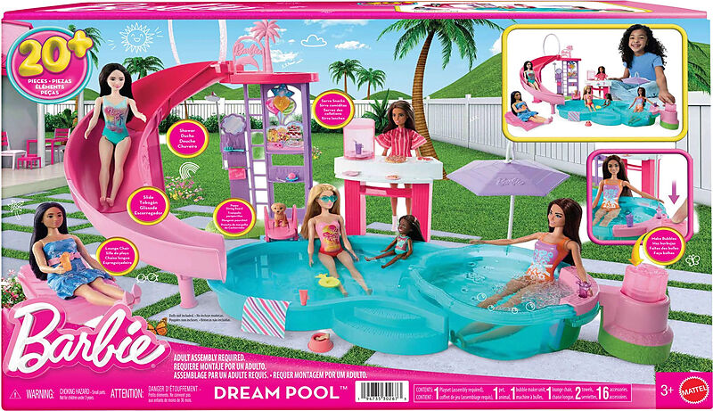 Willkommen am Barbie Traumpool, wo jeder Tag ein herrlicher Pooltag ist! Mit diesem Set können Kinder direkt in den Spielspaß eintauchen. Es umfasst sechs Spielbereiche, wie einen Pool, eine Rutsche, einen Whirlpool und eine Snackstation, sowie über 20 Zubehör...