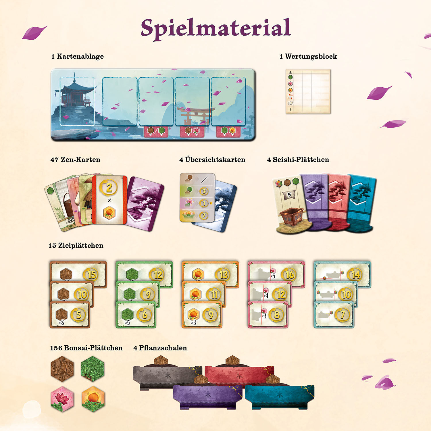 Tolles Legespiel mit einfachen Regeln und großer Spieltiefe. Für unterhaltsame Spieleabende mit der ganzen Familie oder Freunden. Bonsai-Bäume entstehen - neue, individuelle Hingucker Runde für Runde. Mit Solo-Variante. Ein prächtiger Bonsai erwacht zum Leben!...
