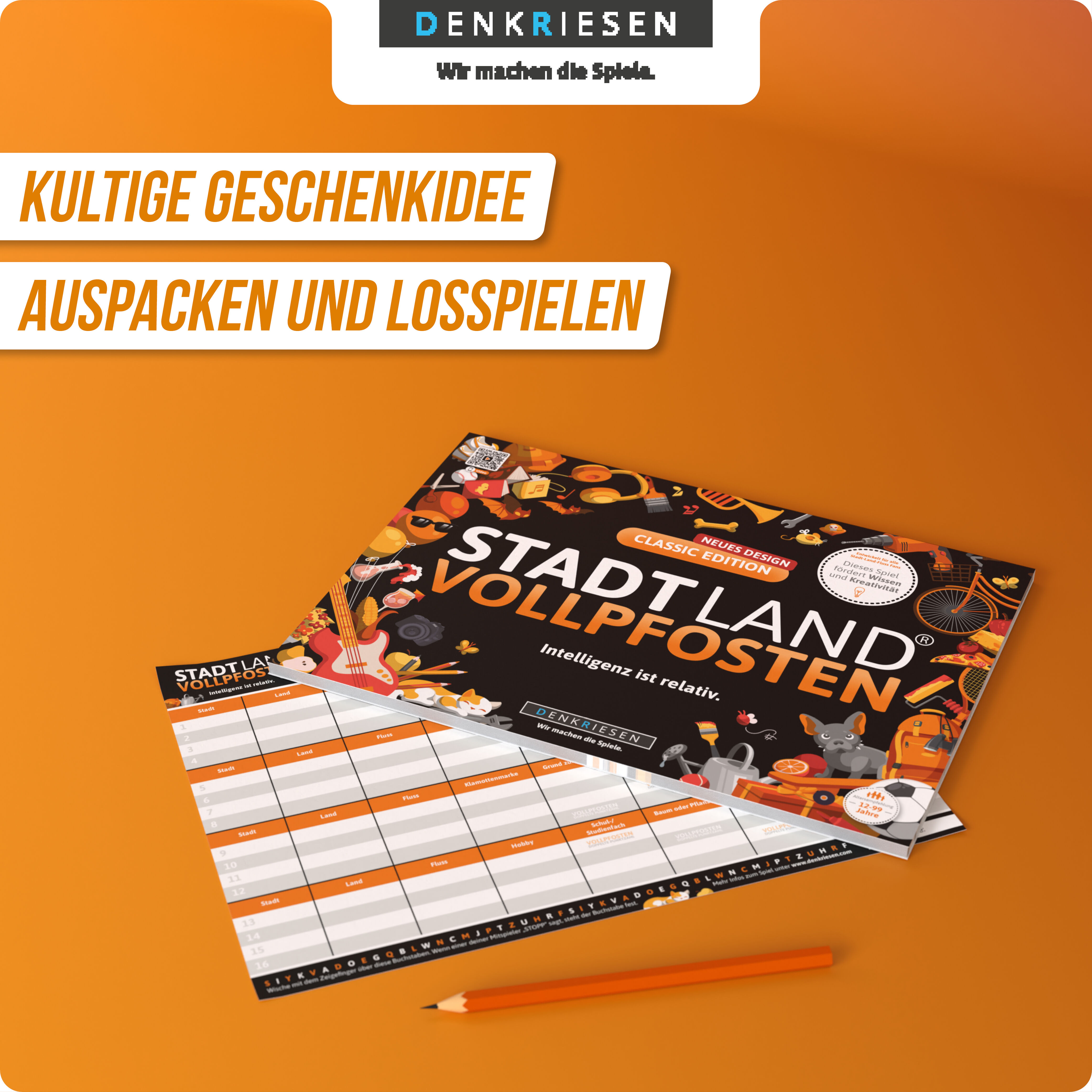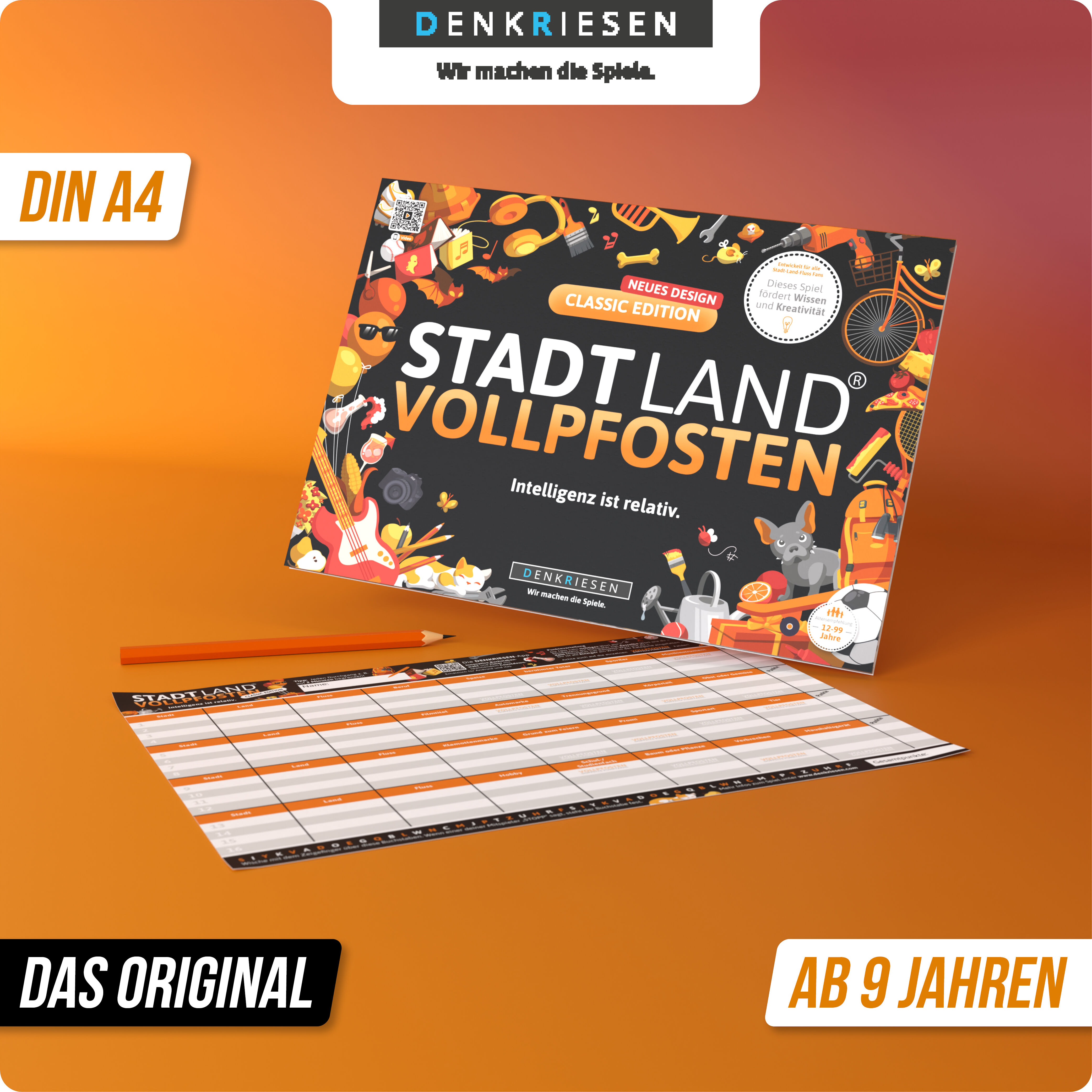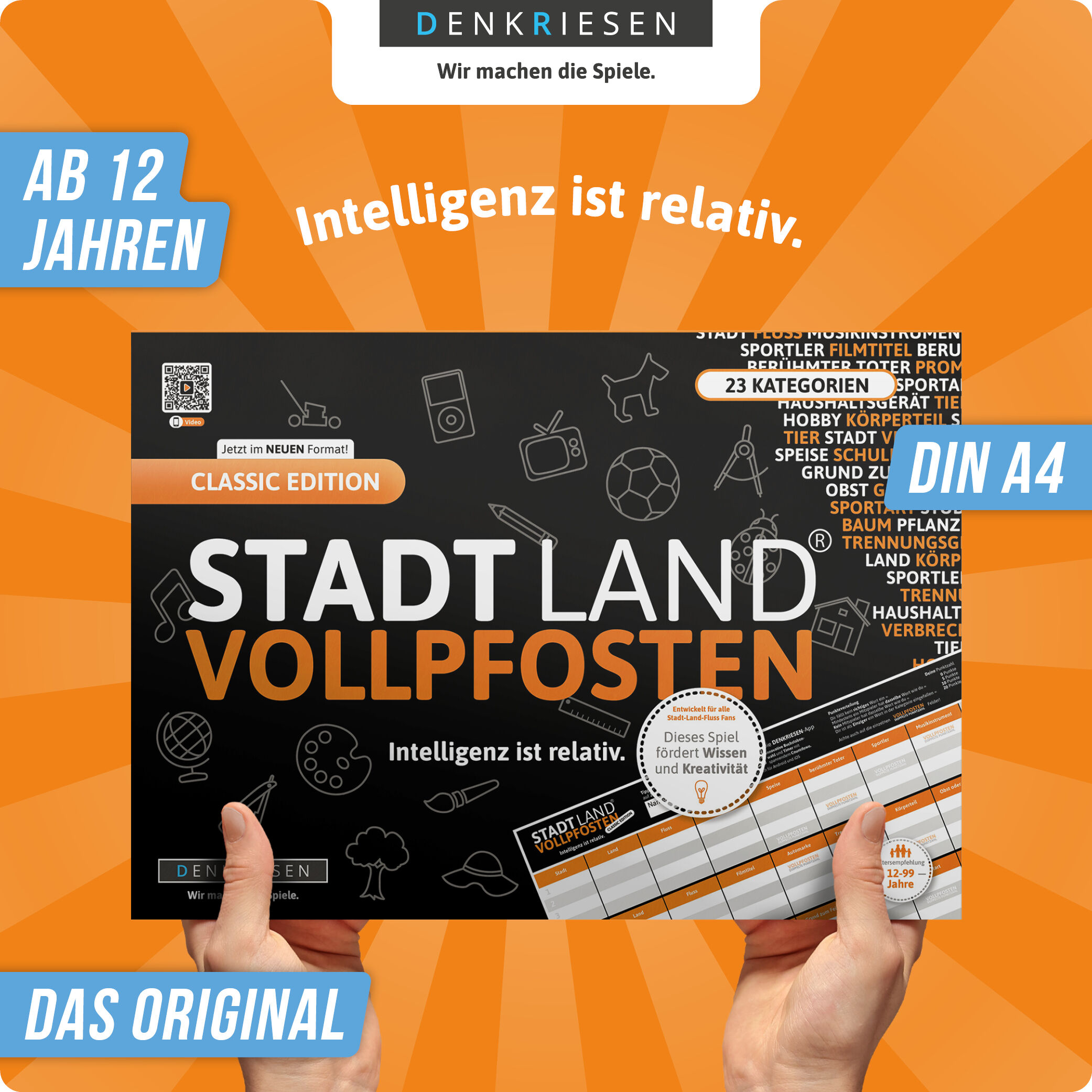 STADT LAND VOLLPFOSTEN - CLASSIC EDITION - Intelligenz ist relativ. (DinA4-Format) Dieser Spielblock ist das wahrscheinlich vielseitigste Stadt-Land-Fluss aller Zeiten. 23 kreative und lustige Kategorien bringen jeden Hobbydenker ins Schwitzen. Spaß garantiert...