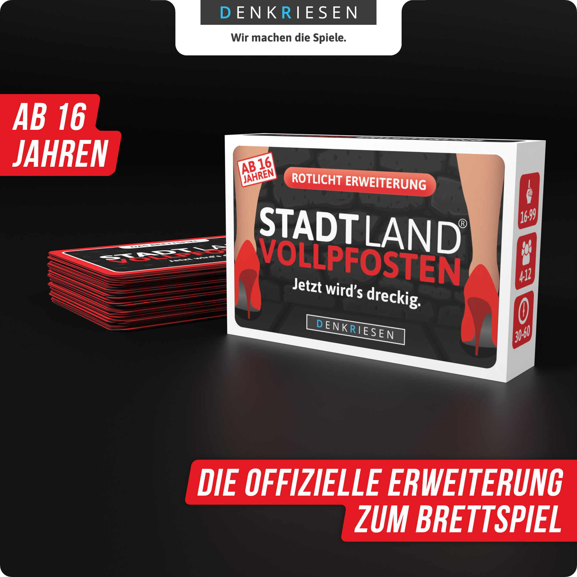 STADT LAND VOLLPFOSTEN® - Das Brettspiel - ERWEITERUNG - ROTLICHT EDITION Jetzt wird's dreckig. Die ROTLICHT Edition von STADT-LAND-VOLLPFOSTEN - Das Brettspiel enthält 354 neue, unanständige Kategorien für verboten guten Spielspaß. Geeignet für Personen ab 16...