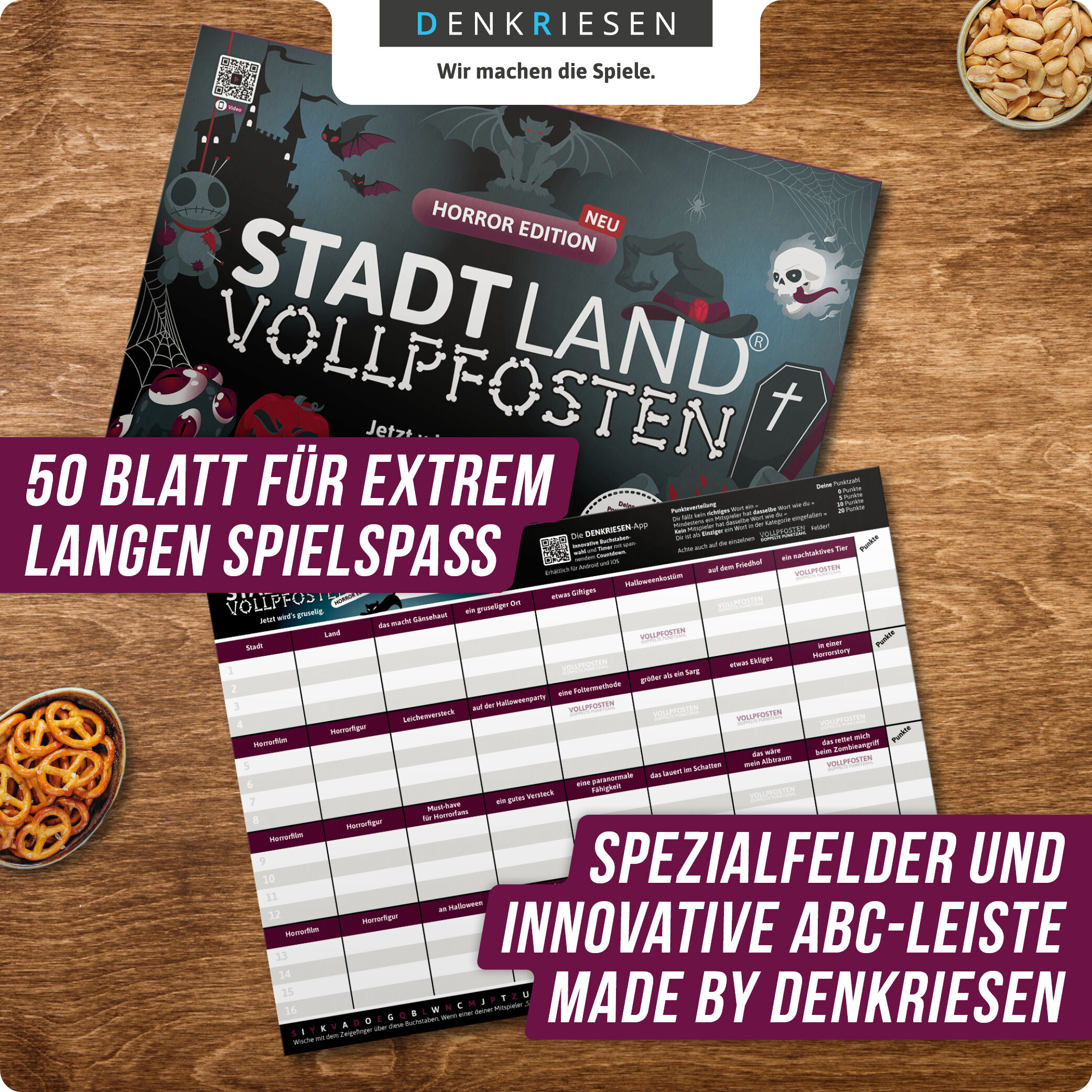 STADT LAND VOLLPFOSTEN® - HORROR EDITION - Jetzt wird's gruselig. - A4 Die unheimliche Edition des Kultspiels STADT LAND VOLLPFOSTEN rund ums Thema Grusel und Horror. Der ultimative Spielblock mit 26 kreativen und lustigen Kategorien für einen schaurig-schönen...