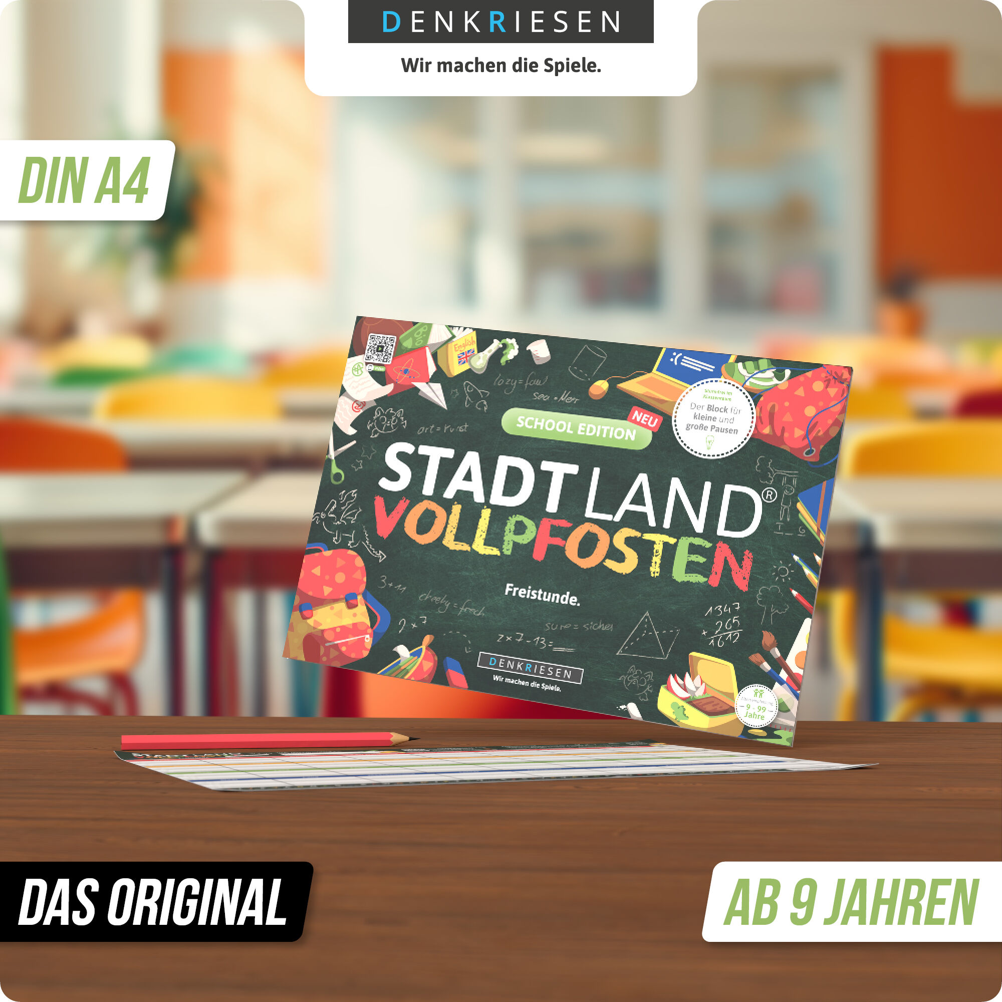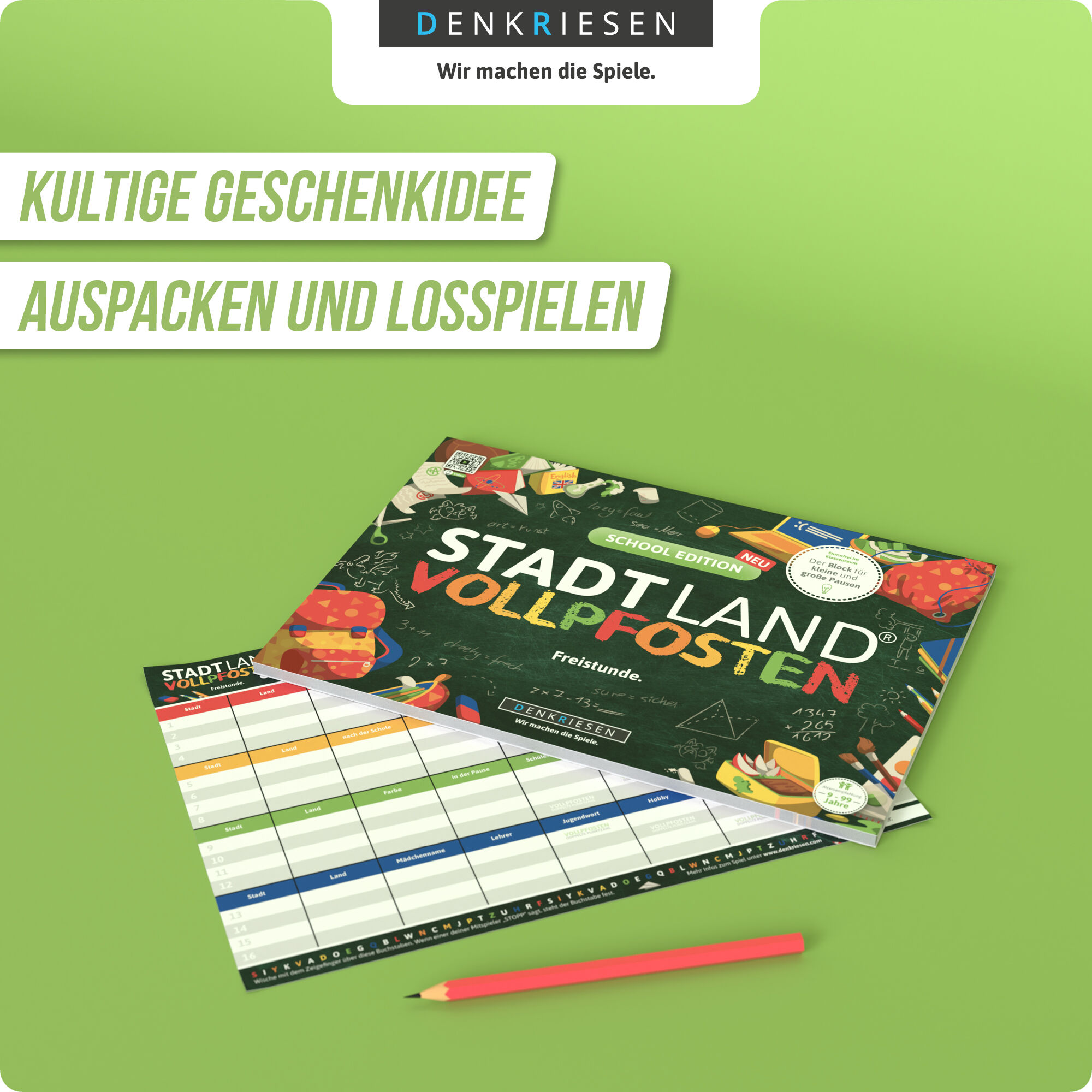 Die schulbezogene Edition des Kultspiels STADT LAND VOLLPFOSTEN® rund ums Thema Alltag der Schüler. Dieser Spielblock mit 26 kreativen und lustigen Kategorien bringt Schwung ins Klassenzimmer und die große Pause. Spaß garantiert!