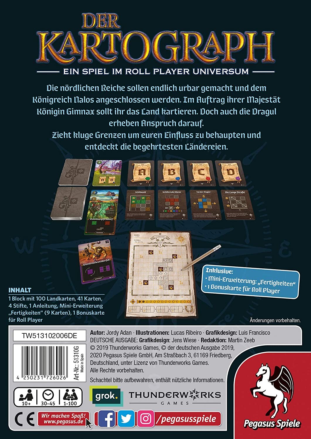 Der Kartograph Die nördlichen Reiche sollen endlich urbar gemacht und dem Königreich Nalos angeschlossen werden. Im Auftrag ihrer Majestät Königin Gimnax sollen die Spielenden das Land kartieren. Doch auch die Dragul erheben Anspruch darauf. Die Kartographinne...