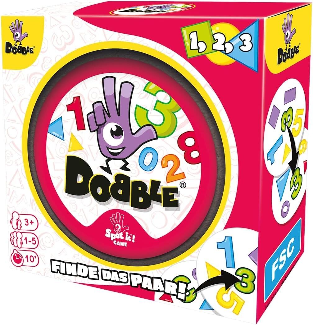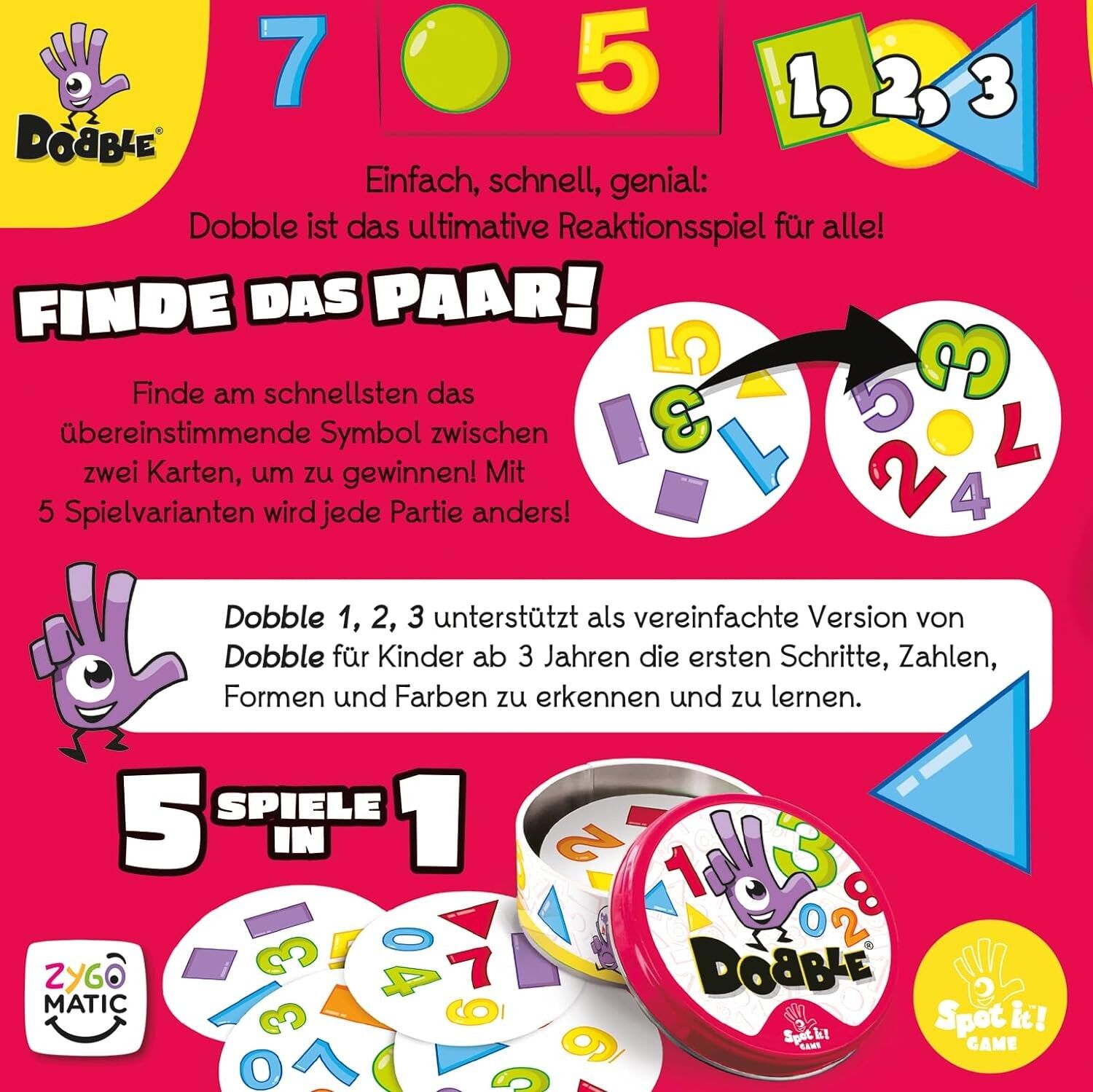 Dobble 1, 2, 3 Mit Dobble 1,2,3 lernst du die Zahlen von 1-9 sowie Formen von Dreiecken, Rechtecken und Quadraten in verschiedenen Farben. Dobble 1,2,3 enthält 31 Karten. Zwischen zwei Karten gibt es immer genau ein übereinstimmendes Symbol. Wer entdeckt es al...