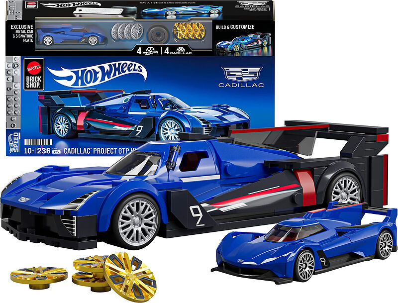 Anschnallen und auf zum rasanten Abenteuer mit dem Cadillac Project GTP Hypercar von Mattel Brick Shop im Maßstab 1:32 zum Zusammenbauen. Dieses detailreiche und authentische Set umfasst Aufkleber zur individuellen Gestaltung, 2 Radkappen-Sets, ein Hot Wheels ...