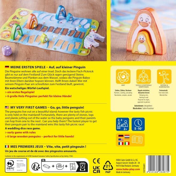 Ein watscheliges Würfel-Laufspiel Die Pinguine wohnen alle auf einer Insel. Doch das leckere Fisch-Picknick gibt es nur auf dem Festland! Zum Glück ragen genügend Steine, Baumstämme und Planken aus dem Wasser, sodass die Pinguin-Babys mit ihren Eltern darüber ...