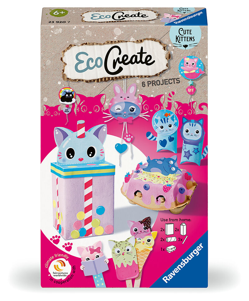 Im EcoCreate Bastelset Niedliche Kätzchen von Ravensburger ist alles enthalten, um aus nicht mehr benötigtem Material (z.B. leere Getränkekartons oder Toilettenpapierrollen) von zu Hause, tolle und einzigartige DIY Projekte zu basteln. Die gebastelten Upcyclin...