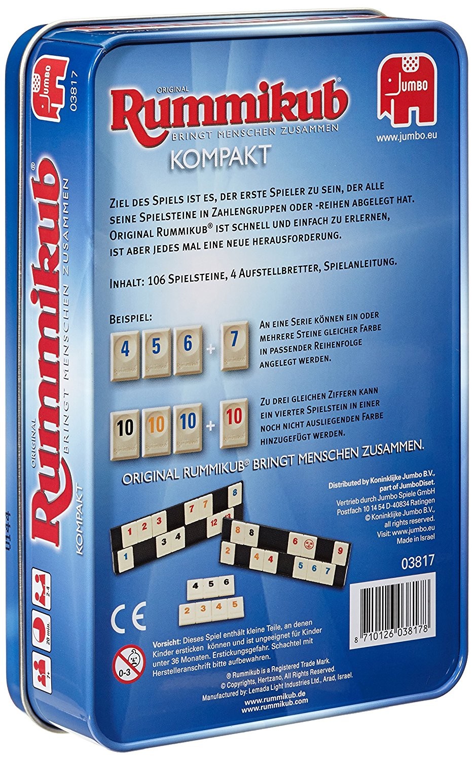 Jumbo 03817 Original Rummikub Kompakt in Metalldose Original Rummikub Kompakt in der kleinen dekorativen Metallverpackung. Und so funktioniert es: 1. Jeder Spieler bekommt verdeckt 14 Spielsteine von seinem linken Mitspieler. 2. Beim ersten Auslegen benötigt j...