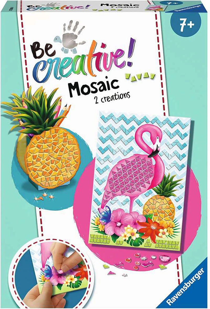 Mit dem Ravensburger BeCreative Set Mosaic Midi Tropical entstehen schöne Bilder und 3D-Objekte aus bunten Mosaikteilen. Zum Einstieg in die Mosaiktechnik dient eine illustrierte Bild-Tafel mit Flamingo und ein 3D-Deko-Objekt in Form einer Stiftebox. Erste kre...