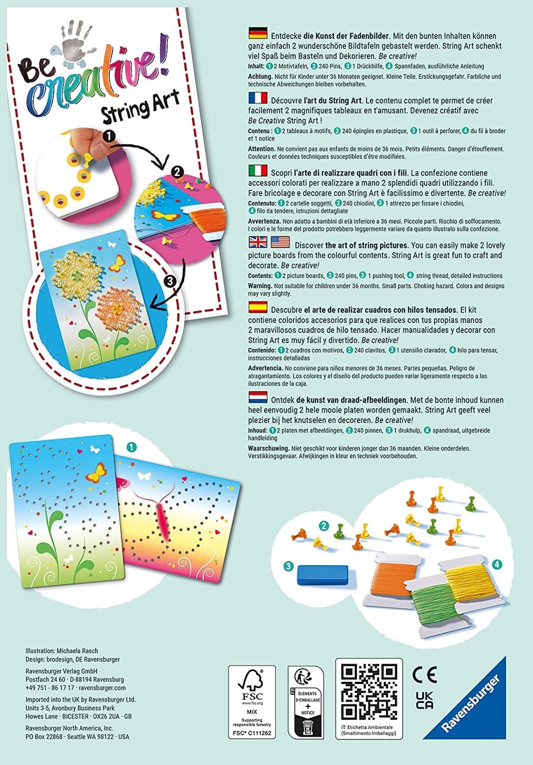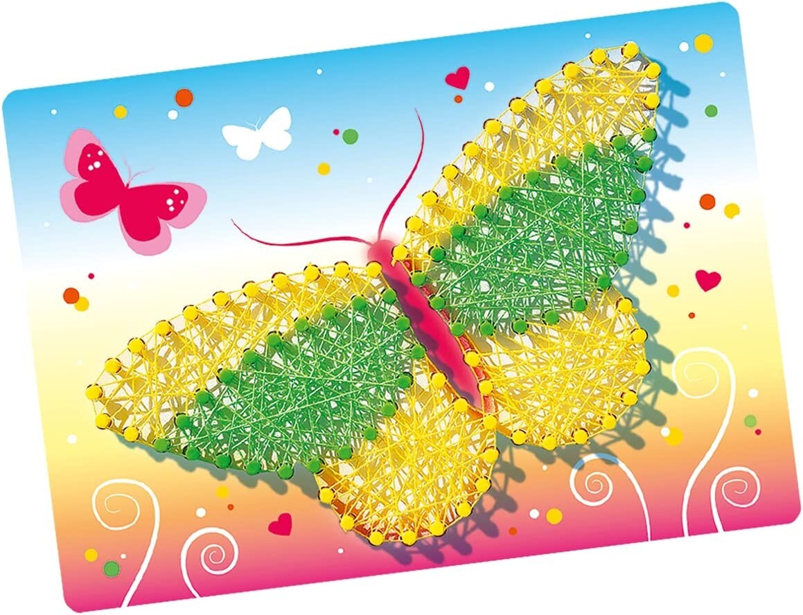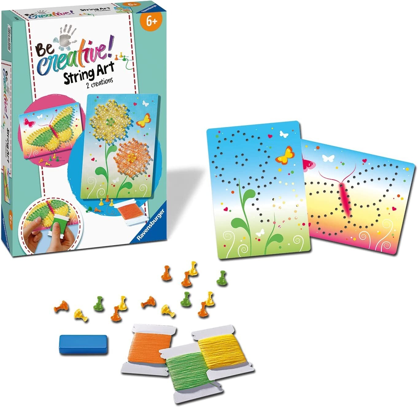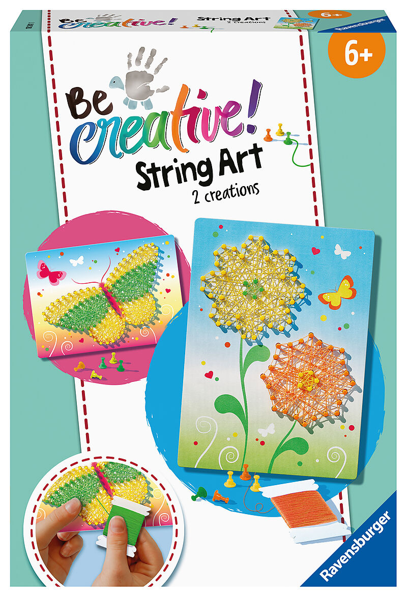 Verwandle Kunststoffpins und bunten Faden kinderleicht in einzigartige String Art Bilder. Inhalt: 2 Motivtafeln, 240 Pins, 1 Drückhilfe für Pins, Spannfaden, Anleitung Mit dem Ravensburger BeCreative Set String Art Butterflies erlernen bereits Kinder ab 6 Jahr...