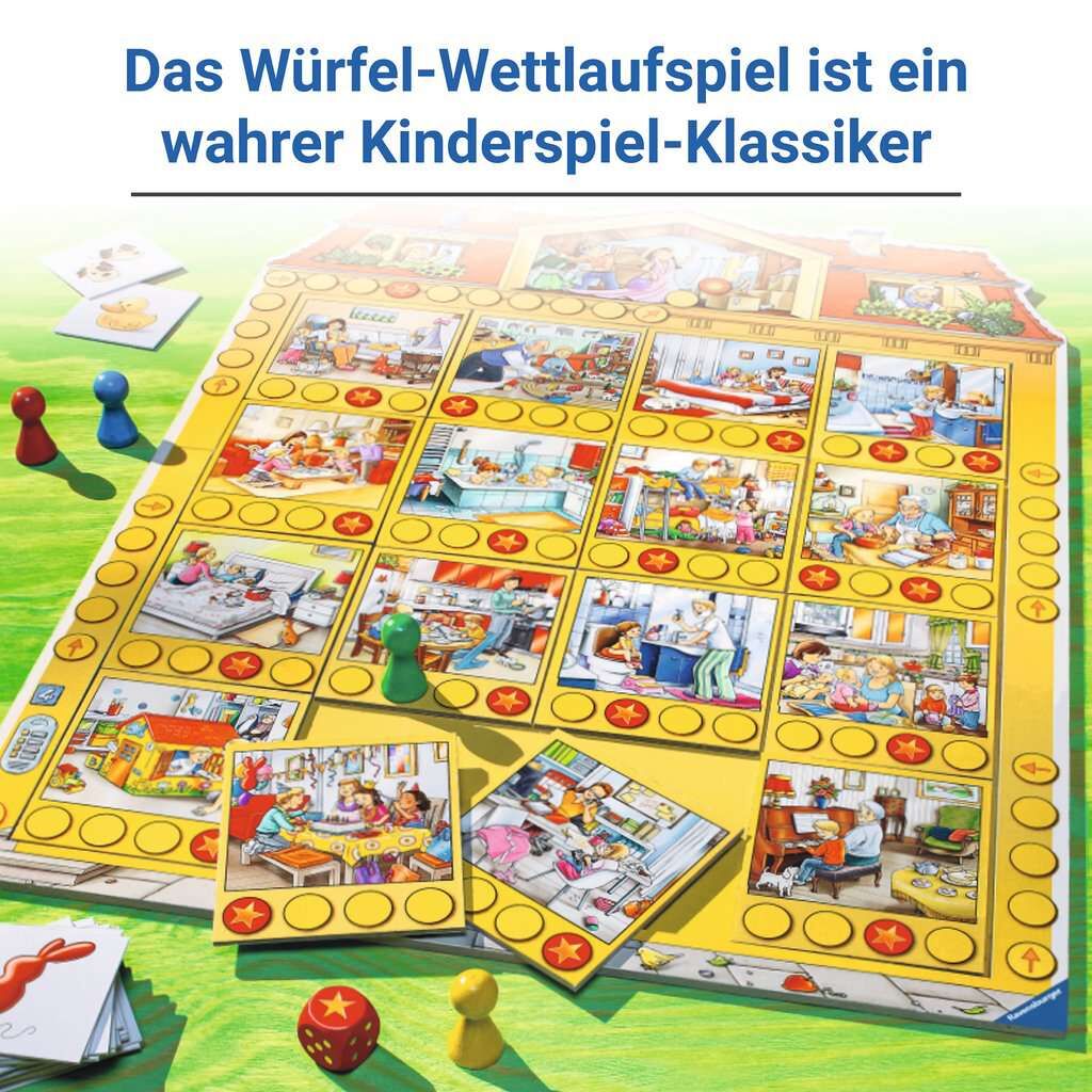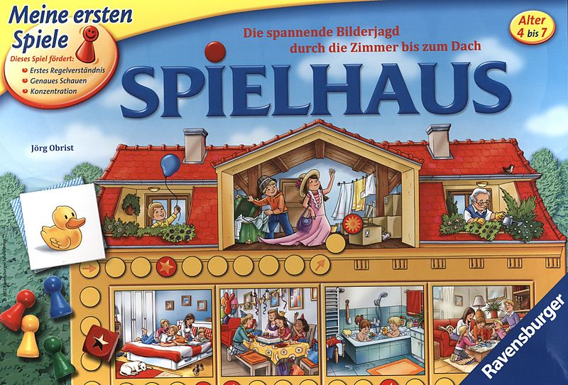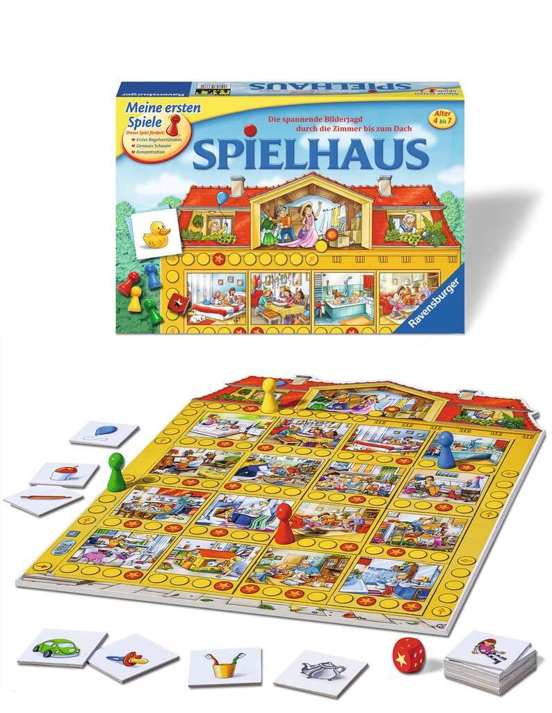 Bei dem Kinderspiel Spielhaus gibt es eine spannende Bilderjagd durch alle Zimmer bis zum Dach. Hier backen die Kinder mit der Oma Kuchen, im anderen Zimmer feiern alle zusammen Kindergeburtstag. Dort spielt ein Kind mit seinem Opa mit der Eisenbahn # und hier...