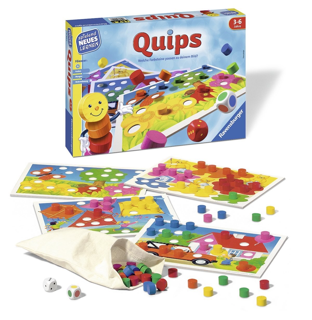 Ravensburger 24920 Quips Bei dem Kinderspiel Quips ist die Frage wer die richtige Anzahl an Steinen aus dem Beutel greift. Wer würfelt die richtige Farbe? Im Dach fehlen zwei rote, im Baum drei grüne Holzsteine. Jedes Kind hat eine Legetafel und muss darauf ac...