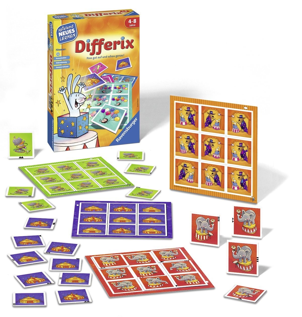 Differix Pass gut auf und schau genau Manege frei und aufgepasst. Schaut der Elefant nach links oder nach rechts? Trägt der zaubernde Hund einen kleinen oder großen Hut? Genaues Schauen wird belohnt. Jedes Kind hat eine Legetafel mit den entsprechenden Kärtche...