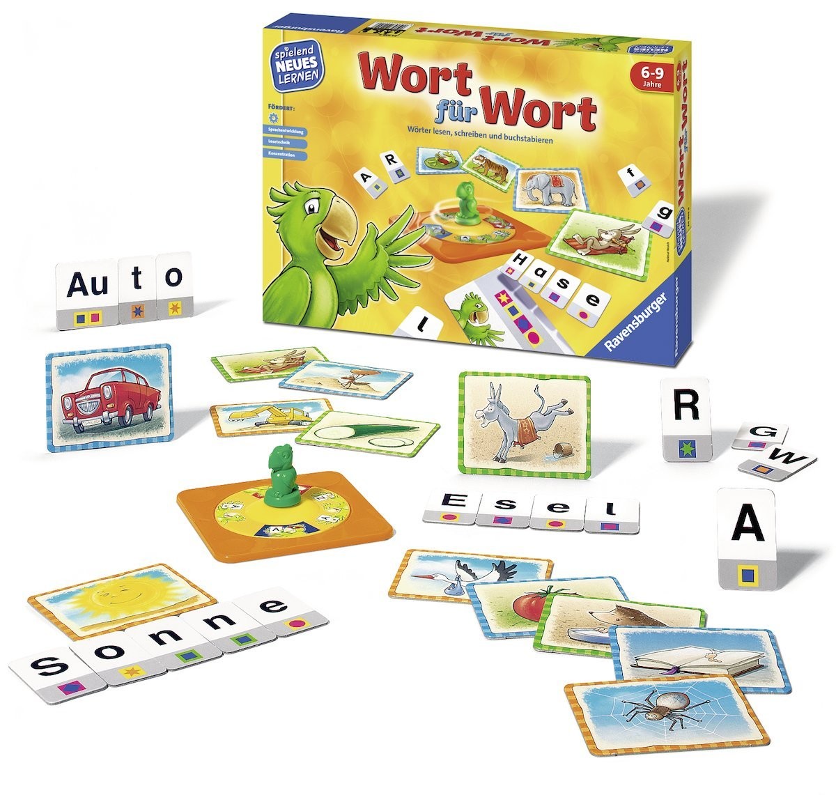 Wie wird "Pirat" geschrieben? Wer legt mit den richtigen Buchstaben das passende Wort zu seinem Bild? Wie viele Buchstaben man nehmen darft, zeigt der freche Papagei auf der Drehscheibe. Ob das Wort richtig geschrieben ist, kann man auf der Bildrückseite selbs...