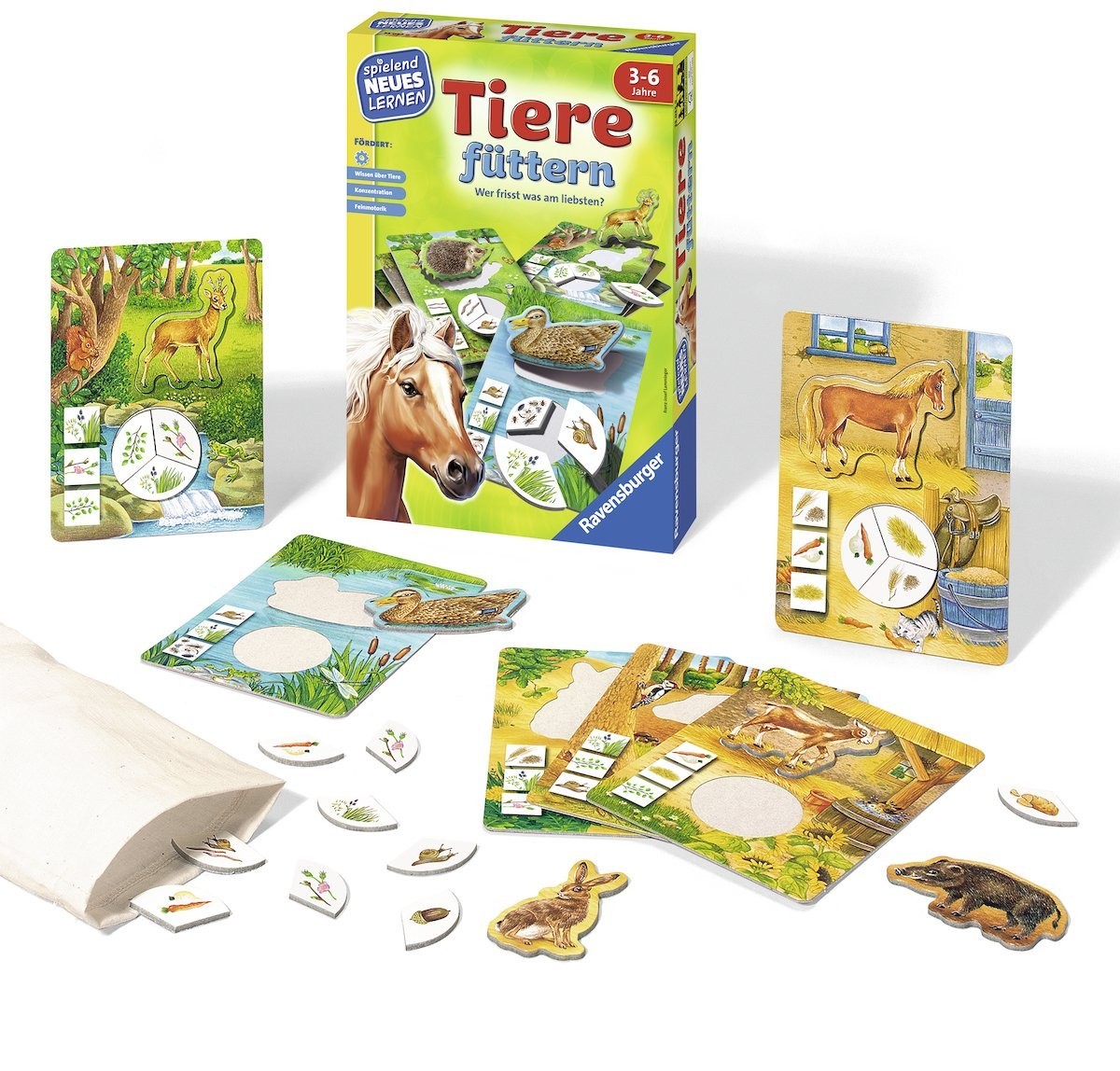 Ravensburger 25034 Tiere füttern Bei dem Kinderspiel Rund um den Kalender ist die Frage was die Tiere am liebsten essen. Es raschelt im Gras! Da ist ein Igel. Wo lebt dieses stachelige Tier und was frisst es am liebsten? Die Kinder wählen erst den Lebensraum u...