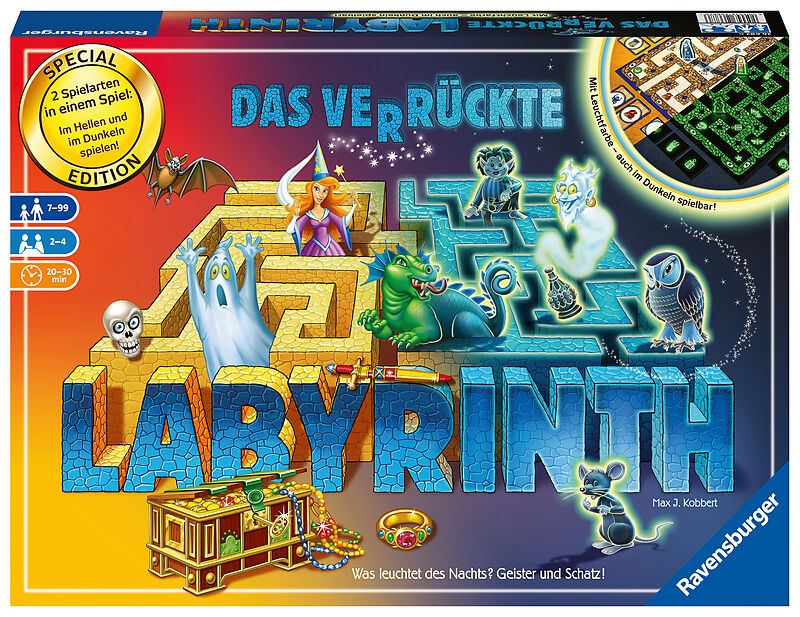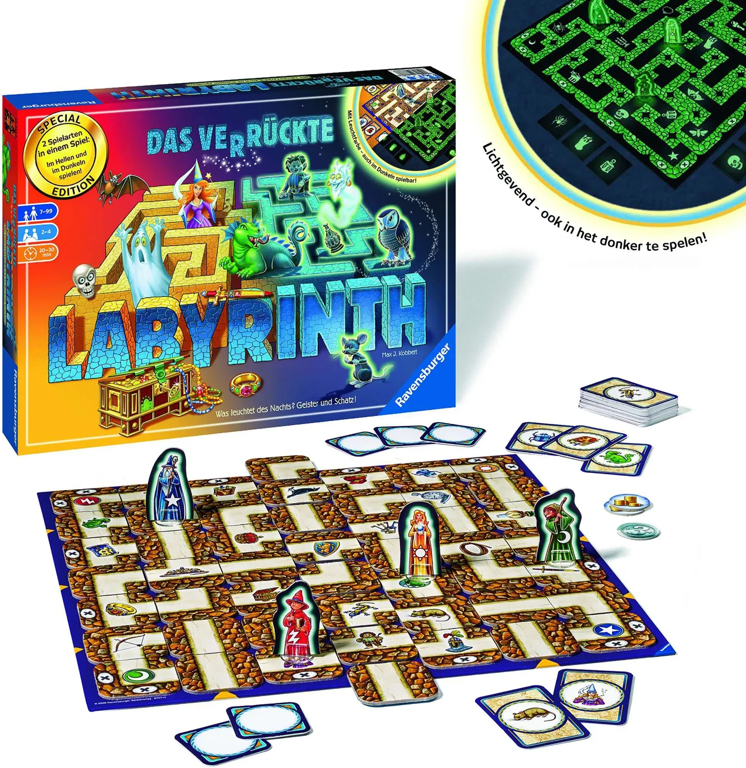 Was leuchtet des Nachts? Geister und Schatz! Dank hochwertiger Leuchtfarbe können die Spieler das Labyrinth erstmals auch in vollkommener Dunkelheit spielen. Ein faszinierendes Spielerlebnis nicht nur für Kinder! Inhalt Inhalt: 1 Spielplan mit 16 festen Gängen...