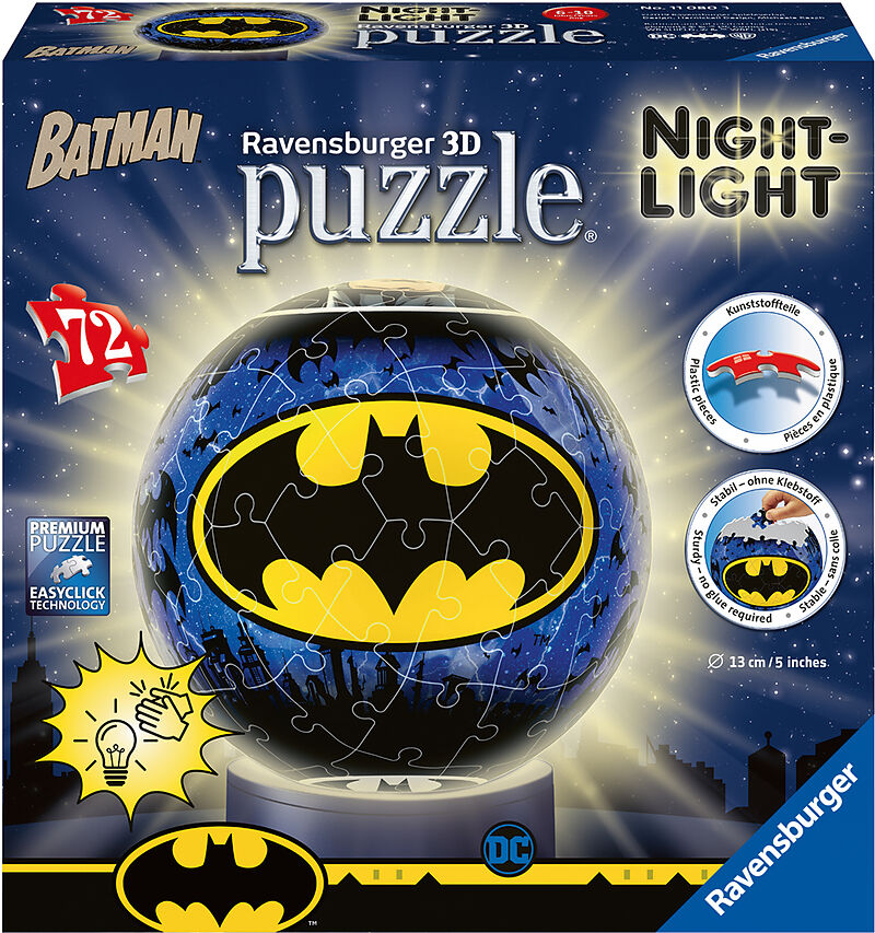Nachtlicht - Batman Erlebe Puzzeln in der 3. Dimension Ravensburger 3D Puzzle - Entdecke Einzigartiges Dieser 3D Puzzle-Ball mit dem Helden Batman wird mit einem Händeklatschen zum außergewöhnlichen Nachtlicht, wenn der Leuchtsockel den Ball von innen erstrahl...
