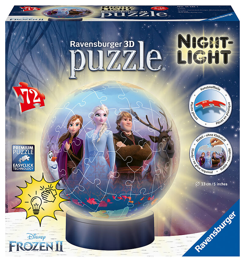 Ravensburger 3D Puzzle 11141 - Nachtlicht Puzzle-Ball Disney Frozen 2 - 72 Teile - ab 6 Jahren, LED Nachttischlampe mit Klatsch-Mechanismus