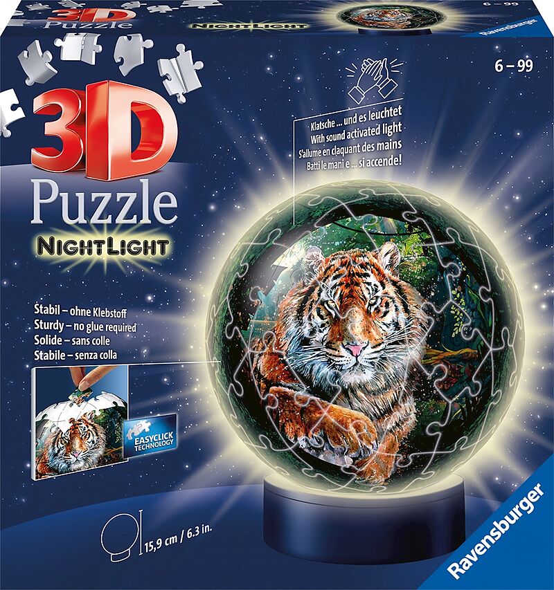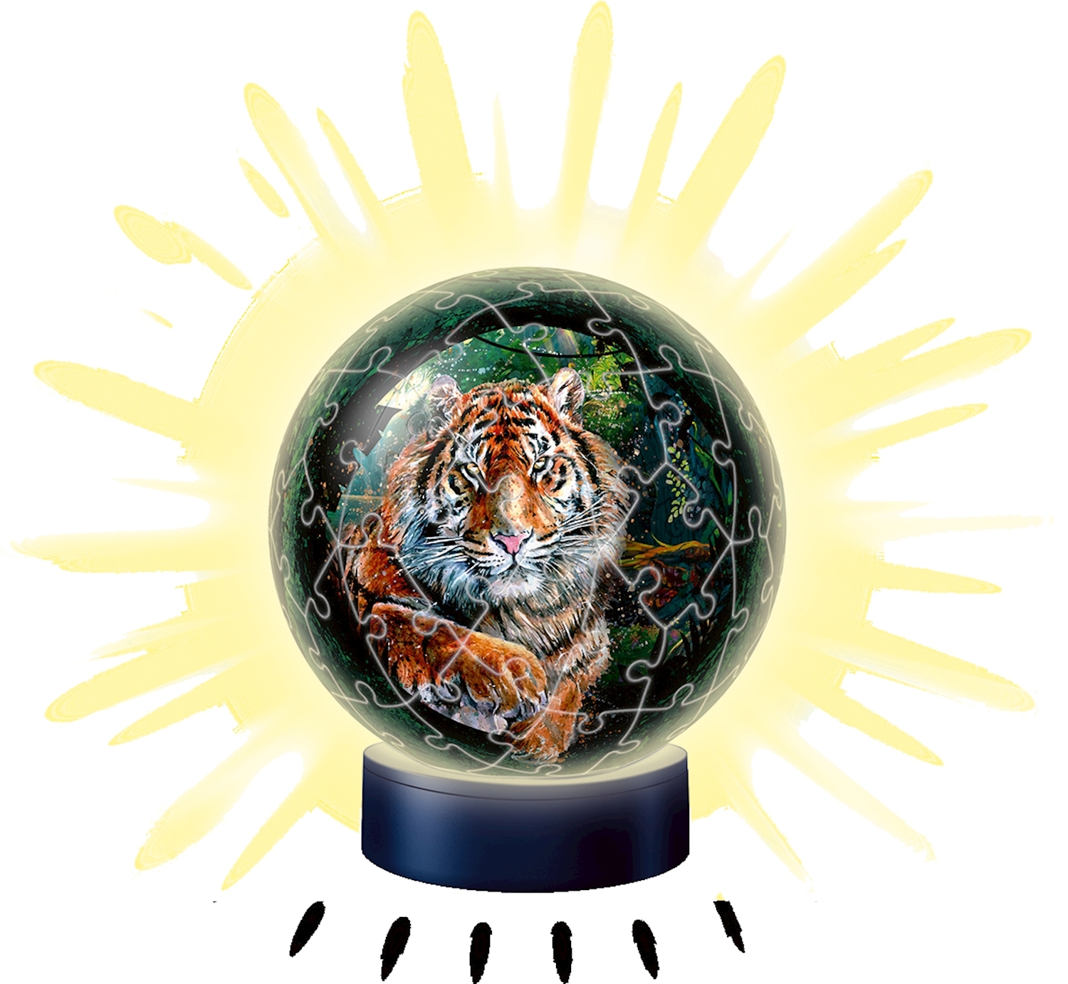 Dieser 3D Puzzle-Ball im coolen Raubkatzen-Design wird mit einem Händeklatschen zum außergewöhnlichen Nachtlicht, wenn der Leuchtsockel den Ball von innen erstrahlen lässt.