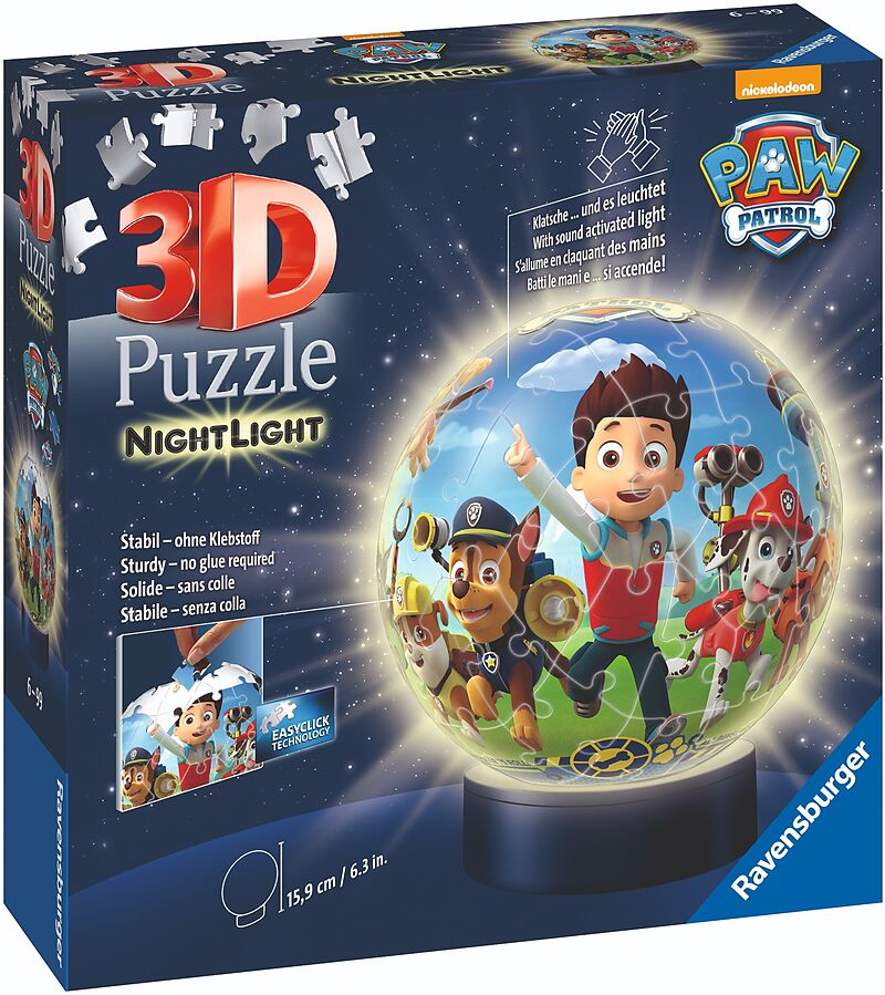 3D Puzzle Ball Nachtlicht Paw Patrol ein echtes Highlight! Dieser 3D Puzzle-Ball mit den Paw Patrol Helden wird mit einem Händeklatschen zum coolen Nachtlicht, wenn der Leuchtsockel den Ball von innen erstrahlen lässt. Dank unserer Easyclick Technology passen ...