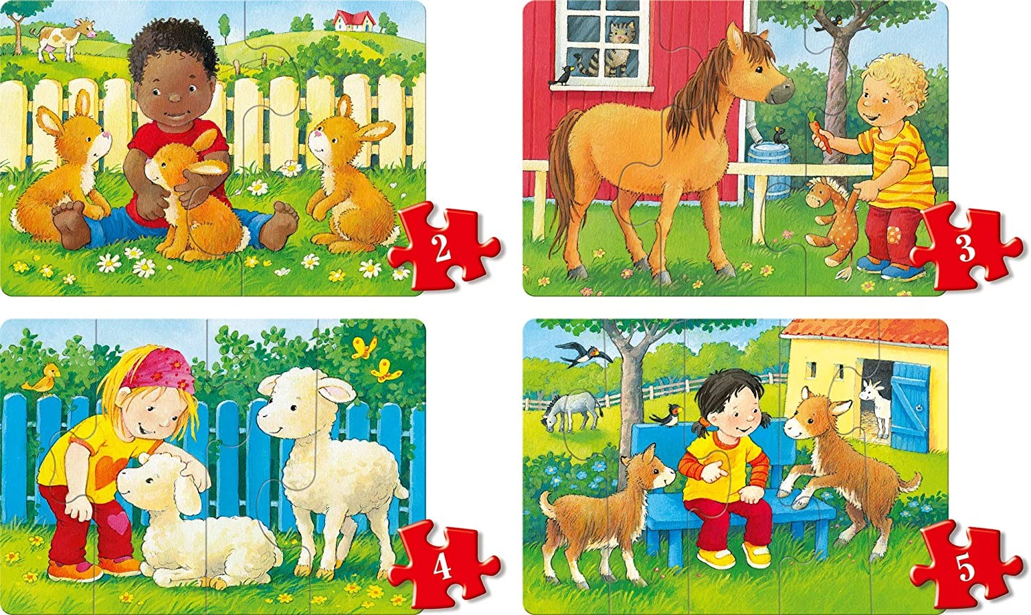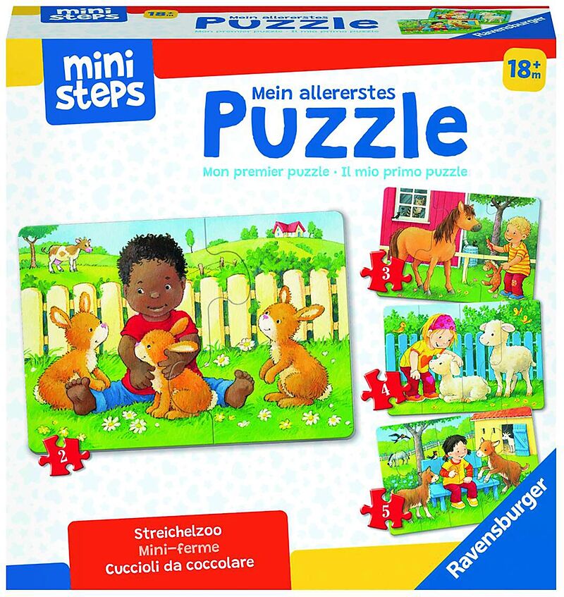 Allererste Streicheltier-Puzzles mit ansteigender Teileanzahl Liebevoll gestaltete Puzzlemotive rund um den Streichelzoo bieten einen optimalen Einstieg ins Puzzlevergnügen. Die großen Teile aus stabiler Pappe lassen sich leicht zusammenpuzzeln und fördern spi...