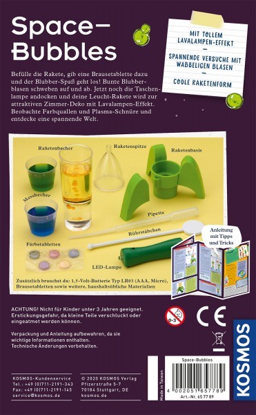 Beleuchte deine Blubber-Rakete Coole Action im Kinderzimmer: In diesem KOSMOS Experimentierset wird eine Raketenbasis zur Experimentierstation für faszinierende Blubber-Effekte! Dafür die Raketenbasis nach der Anleitung mit Öl und farbigem Wasser auffüllen und...