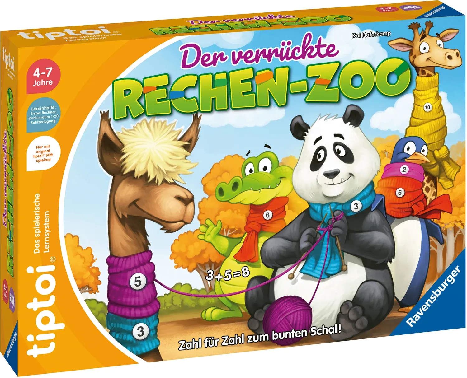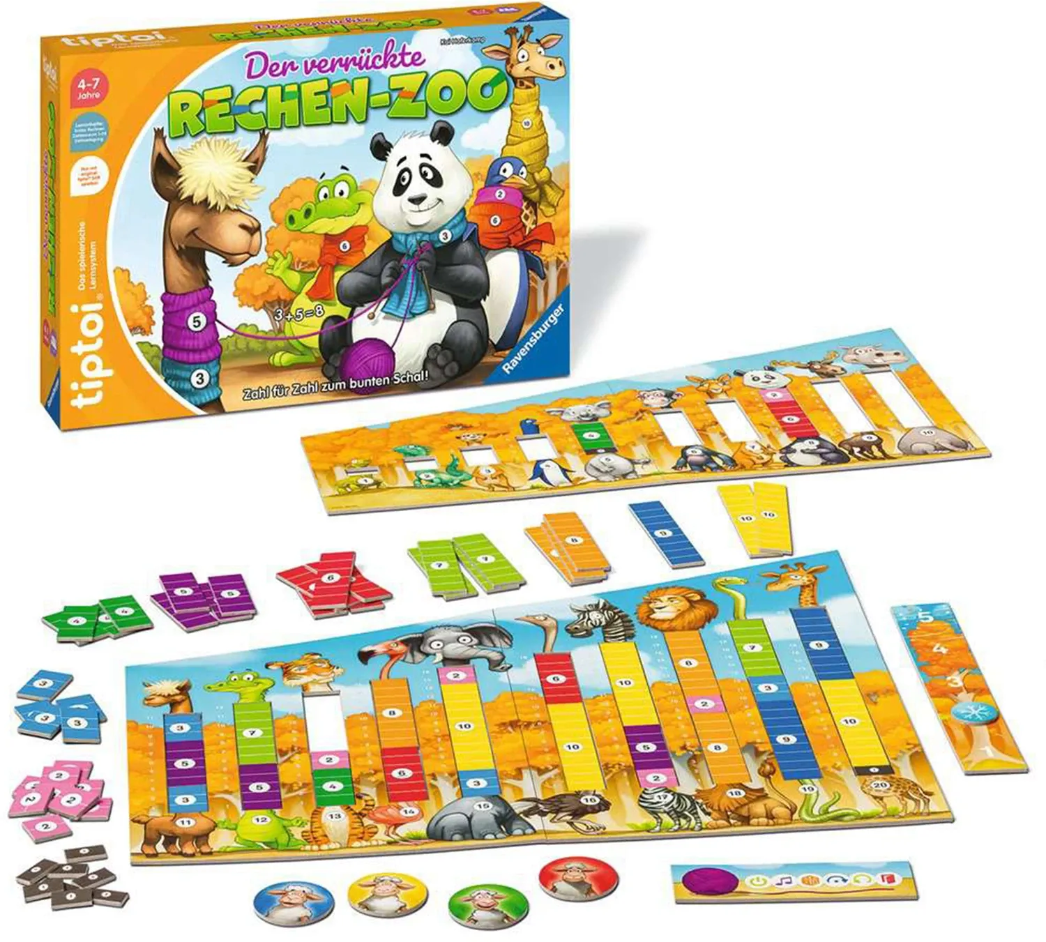 Den Tieren ist kalt! Bevor der Winter hereinbricht, stricken ihnen die Kinder gemeinsam Schals. Das Alpaka mochte einen Schal aus zwei Farben. Ein blaues Teil mit drei Streifen, ein rotes mit funf Streifen: 3 + 5 = 8. Durch Addieren der beiden Zahlen lernen kl...
