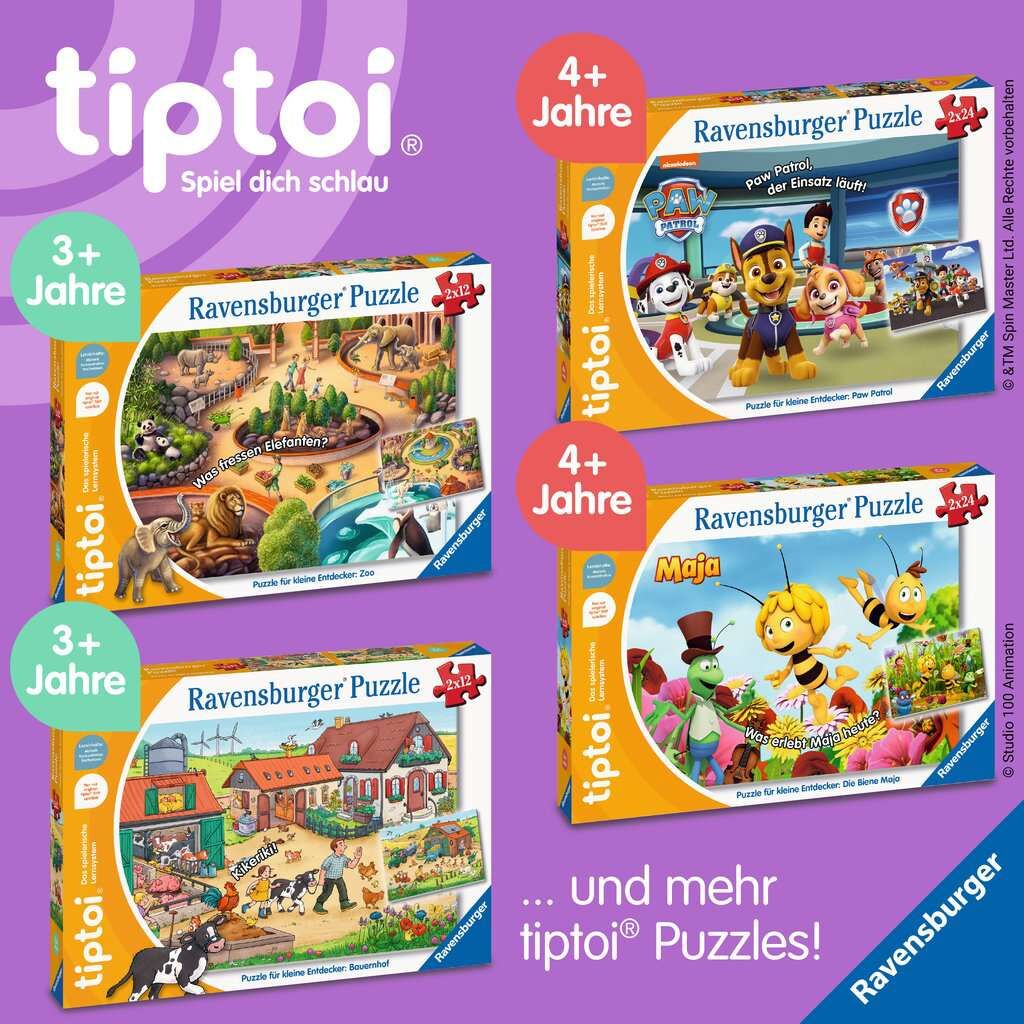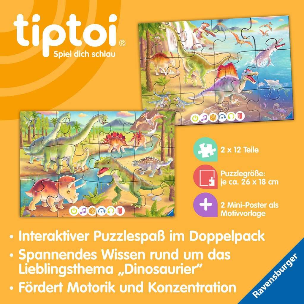 Doppelter Puzzlespaß mit tiptoi: Zwei farbenfrohe Motive zeigen die Welt der Dinosaurier. Sobald alle Puzzleteile zusammengesetzt sind, können die Kinder mit dem tiptoi-Stift die Riesenechsen entdecken. Auf jedem Puzzle sind unterschiedliche Dinos dargestellt....