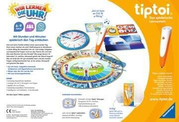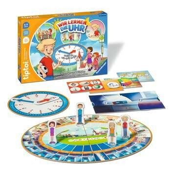 Inhalt: 1 beidseitig bespielbarer Spielplan, 1 analoge Uhr mit 2 Uhrzeigern aus Pappe, 1 digitale Uhr aus Pappe, 4 beidseitig bespielbare Themenkarten, 4 Spielfiguren mit Aufstellern. tiptoi-Stift nicht enthalten. Muss separat erworben werden.