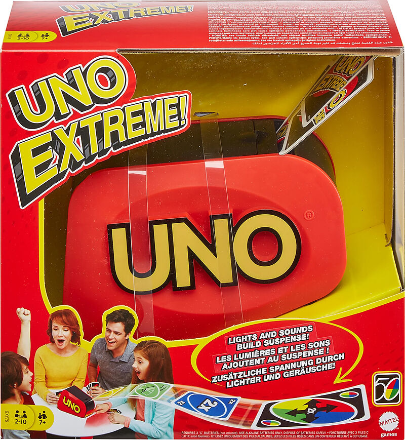 Mattel GXY75 UNO Extreme UNO wartet mit einer actiongeladenen, aufregenden Spielvariante auf. Wenn ein Spieler die Aktionskarte ''Angriff zieht, dann muss er auf die elektronische Kartenschleuder des UNO Extreme-Spiels drücken. Wenn er Glück hat, passiert nich...