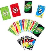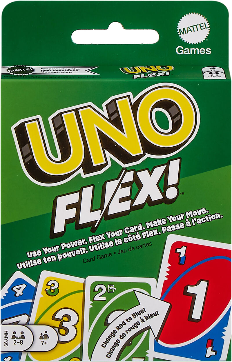 UNO Flex ist eine neue Version von UNO, bei der du selbst bestimmst, wann du Power Cards einsetzt, Klassisches UNO-Spiel, bei dem Farbe und Zahl gematched werden, aber jetzt mit Aktionskarten, 112 Karten sind enthalten. Ab 7 Jahren.