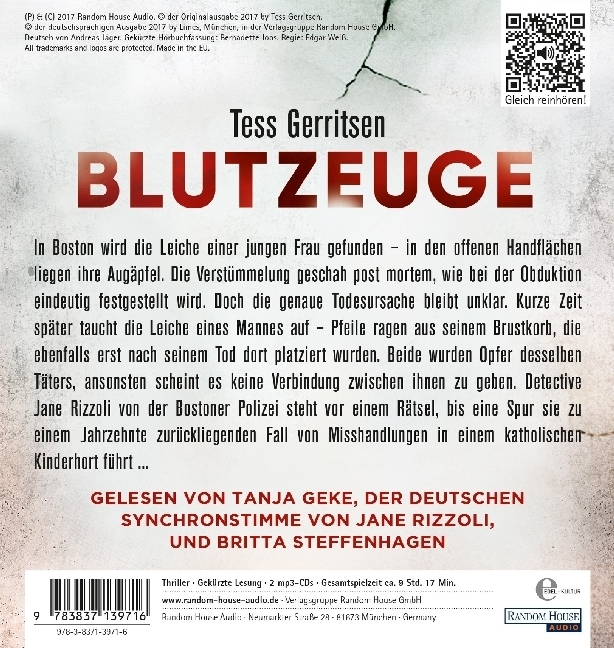 Blutzeuge (MP3) Geke,Tanja/Steffenhagen,Britta Sie haben das Böse gesehen - und er lässt sie mit ihrem Blut zahlen. In Boston wird die Leiche einer jungen Frau gefunden - in der offenen Handfläche liegen ihre Augäpfel. Die Verstümmelung geschah post mortem, wi...| 1 | Blutzeuge |