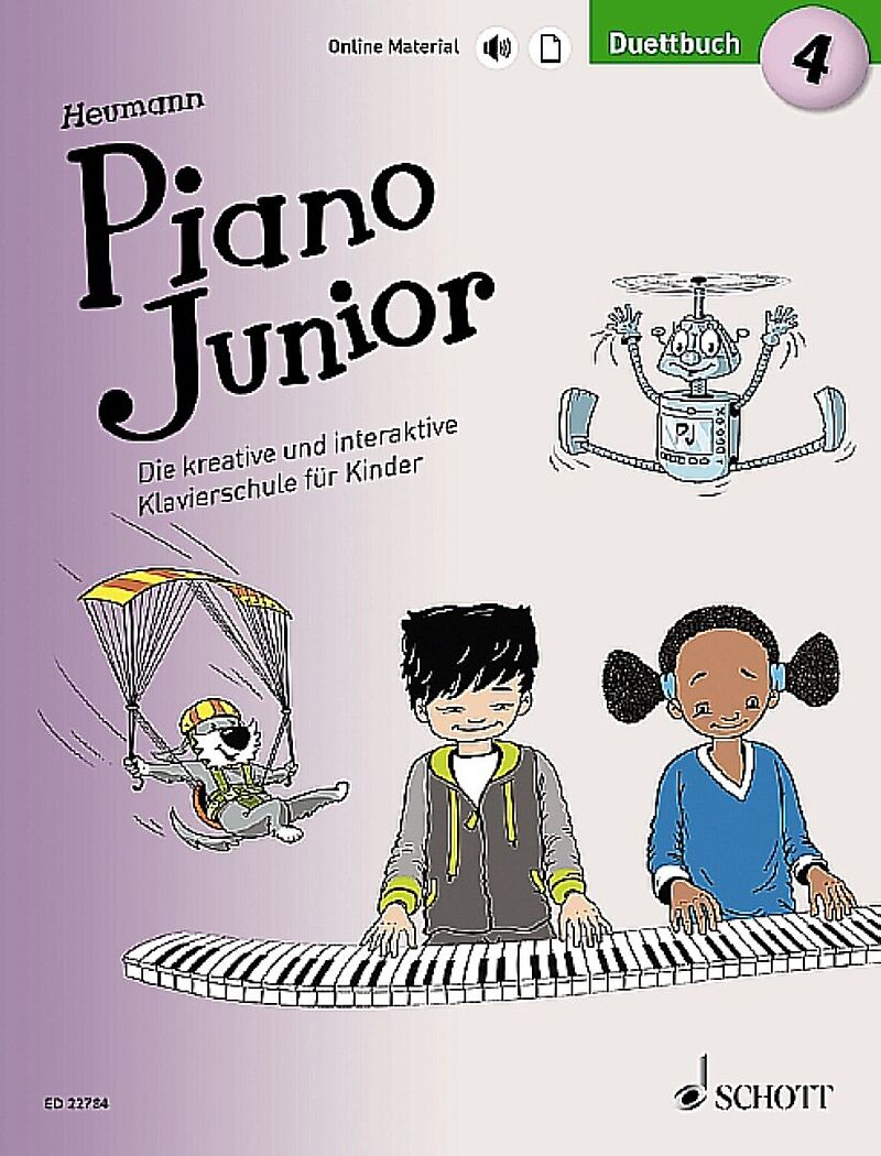 Duettbuch zu Piano Junior Band 4 . Der ideale Begleiter zur Piano Junior Klavierschule Band 4 . Enthält 14 leichte, nach Schwierigkeitsgrad geordnete Duette . Ermöglicht das Zusammenspiel ab den ersten Unterrichtsstunden Piano Junior, die neue Klavierschule für Kinder ab 6 Jahren, möchte Kindern nachhaltig Spaß am Klavier lernen vermitteln. In diesem neuartigen Konzept von Hans-Günter Heumann begleitet der liebenswerte Roboter "PJ" gemeinsam mit seinem Hund "Mozart" und ihren drei Freunden die kleinen Pianisten durch die ersten Unterrichtsjahre. Freude und Spaß an der Musik stehen im Vordergrund und der Fortschritt wird schnell hörbar. Begleitende Website mit vielfältigem Zusatzmaterial: Das Besondere bei diesem Lehrwerk ist die begleitende Website als Teil der Methode: Videos zeigen den Weg zur richtigen Technik, Audioaufnahmen helfen beim Einüben der Stücke, Übungsblätter und weiteres Material bieten zusätzliche Möglichkeiten zum Vertiefen der Inhalte. Umfassendes Konzept - zeitgemäß und flexibel: Zu jedem Band der Klavierschule stehen jeweils drei Begleithefte zur Verfügung mit vielfältigem Arbeitsmaterial und passenden Spielstücken für einen abwechslungsreichen Unterricht, der den unterschiedlichen Bedürfnissen der Schüler gerecht wird: . Klavierschule 4 (ED 22764) . Theoriebuch 4 (ED 22774) . Duettbuch 4 (ED 22784) . Konzertbuch 4 (ED 22794) Schwierigkeitsgrad: 1-2