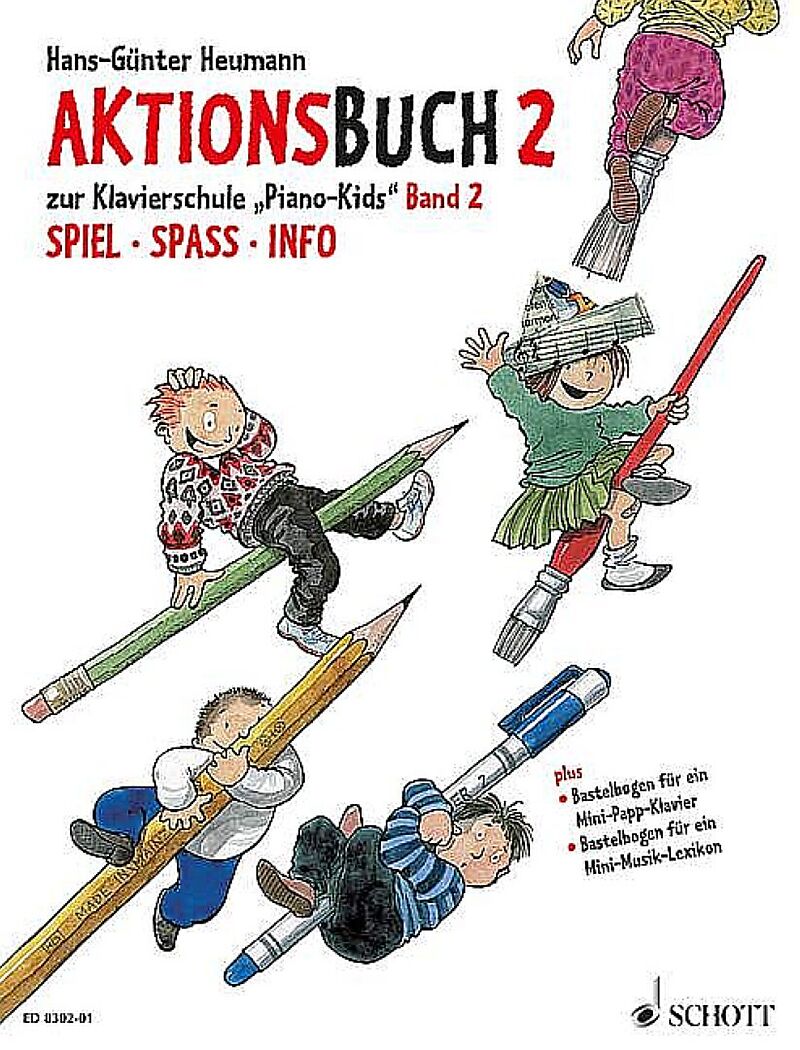 Band 2 (ED 8302): - Violinschlüssel in beiden Händen - Bassschlüssel in beiden Händen - G-Lage (L.H. 1 Oktave tiefer) - Erweiterung des Quintraumes / Spreizen der Finger - Lagenwechsel / Etüde - Fingerwechsel auf derselben Taste - Unter- und Übersatz - Halb- und Ganztonschritte - Die C-Dur-Tonleiter - Der C-Dur-Akkord - KLAVIER QUIZ 1 - Die G-Dur-Tonleiter - Die D-Dur-Tonleiter - Der 6/8-Takt - Die F-Dur-Tonleiter - KLAVIER QUIZ 2 - Die Moll-Tonleiter - a-Moll - Der Moll-Akkord - Die e-Moll-Tonleiter - Das rechte Pedal - Die d-Moll-Tonleiter - KLAVIER QUIZ 3 - Spielstücke: C. Czerny: Allegretto, op. 823/7 - H.-G. Heumann: Rollerskate Rock - H.-G. Heumann: Holzschuhtanz - For He's a Jolly Good Fellow (Englisches Volkslied) - H.-G. Heumann: Dino Beat - L. Mozart: Menuett aus dem "Notenbuch für Nannerl" - P.W. Meacham: American Patrol - M.C. Freedmann/J. de Knight: Rock Around the Clock - H.-G. Heumann: Primaballerina - J. Offenbach: Cancan aus der Operette "Orpheus in der Unterwelt" - J. Haydn: Mit dem Paukenschlag, Thema aus der gleichnamigen Sinfonie - M. Clementi: Rondo, Thema aus op. 36/5, 3. Satz - A. Bruckner: Kleines Stück - Red River Valley (Trad.) - M.J. Hill: Geburtstagslied - L.v. Beethoven: Hirtenmelodie, Thema aus der 6. Sinfonie "Pastorale" - G. Rossini: Wilhelm Tell, Thema aus der Ouvertüre der Oper - C. Saint-Saens: Der Elefant aus "Karneval der Tiere" - H.-G. Heumann: Tarantella - J. Ivanovici: Donauwellen, Walzer - Scarborough Fair (Simon & Garfunkel/Trad.) - P.I. Tschaikowsky: Schwanensee, Thema aus dem gleichnamigen Ballett - C. Gurlitt: Rascher Entschluß aus Klavierstücke op. 179 - J.S. Bach: Bourrée aus der Suite Nr. 1 für Laute (BWV 996) - . - Aktionsbuch 2 (ED 8302-01): - Das Metronom - Die Klatschecke 1 - Spiel mit Rhythmus-Täfelchen - Ordne Noten der Klaviatur zu - Komponiere eine zweite Stimme - Transponiere in andere Lagen - Wandere mit Finger in Gegenbewegung - Schreibfehler - Wer knackt die (Noten-)Nuß? - Der Klaviatur-Zebrastreifen - Die C-Dur-Tonleiter-Pyramide - Musikverlag sucht Begleitung einer Melodie mit 2 Akkorden - Sänger sucht Begleitung einer Melodie mit 3 Akkorden - Dreiklänge auf jeder Stufe - Kadenz in C-Dur - Jim und das Boogie Piano - Schöne Bescherung! - Zum Nachzeichnen (G-Dur-Tonleiter, -Tonart, -Akkord) - Hauptdreiklänge in G-Dur - Zum Nachzeichnen (D-Dur-Tonleiter, -Tonart, -Akkord) - Hauptdreiklänge in D-Dur - Der Vampir am Klavier - Die Klatschecke 2 - Zum Nachzeichnen (F-Dur-Tonleiter, -Tonart, -Akkord) - Hauptdreiklänge in F-Dur - Stell mich auf den Kopf! - Improvisiere weiter mit viel Pedal - Auflösungen - Übersicht: Klaviatur-Notensystem - Beilagen: Mini-Musik-Lexikon - Klavier-Bastelbogen