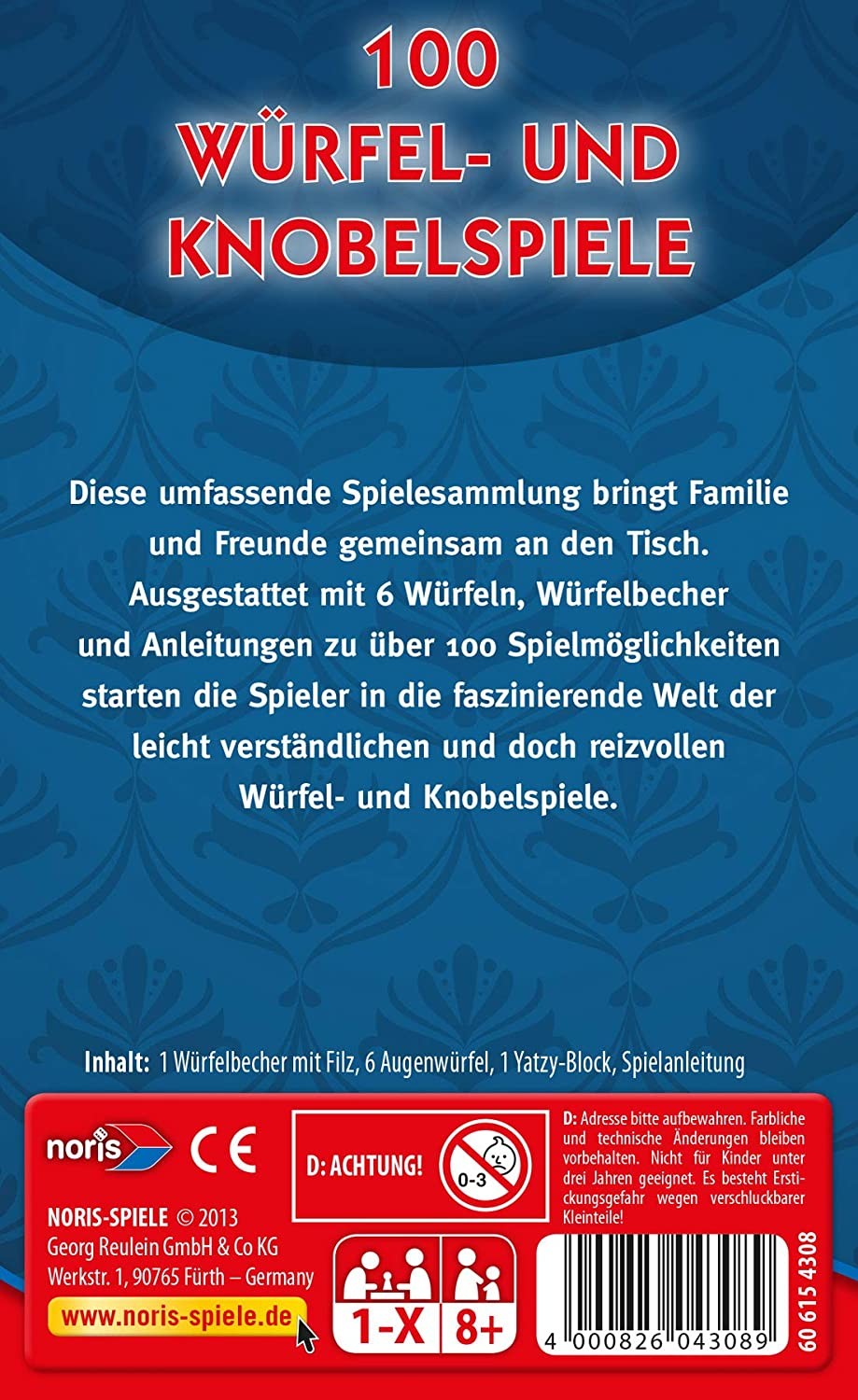 100 Würfel- und Knobelspiele. Diese umfassende Spielesammlung bringt Familie und Freunde gemeinsam an den Tisch. Ausgestattet mit 6 Würfeln, Würfelbecher und Anleitungen zu über 100 Spielmöglichkeiten starten die Spieler in die faszinierende Welt der leicht ve...