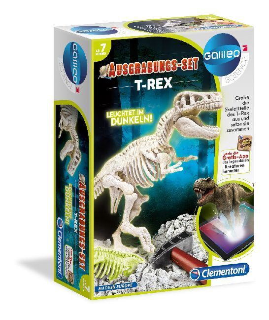 Clementoni Galileo Ausgrabungsset Glow in the dark - Dinosaurier T-Rex Kinder tauchen ein in die Welt der Paläontologie und lernen prähistorische Tiere kennen. Wenn sie im Erdblock graben, werden sie ein fantastisches Skelett des furchterregenden T-Rex freileg...