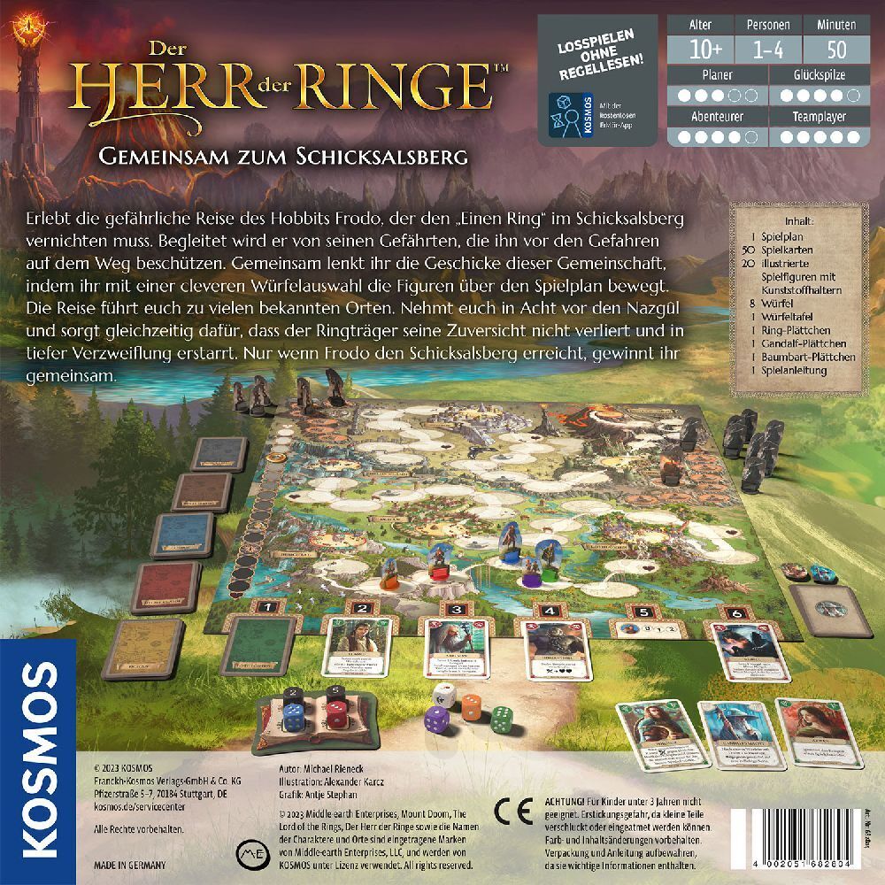 rodos Reise zum Schicksalsberg steckt voller Gefahren. Zum Glück beschützen ihn seine treuen Freunde auf seinem Weg. Mit einer cleveren Würfelauswahl bewegen die Spielerinnen und Spieler die Figuren über den Spielplan. Erreicht Frodo den Schicksalsberg? Dann g...