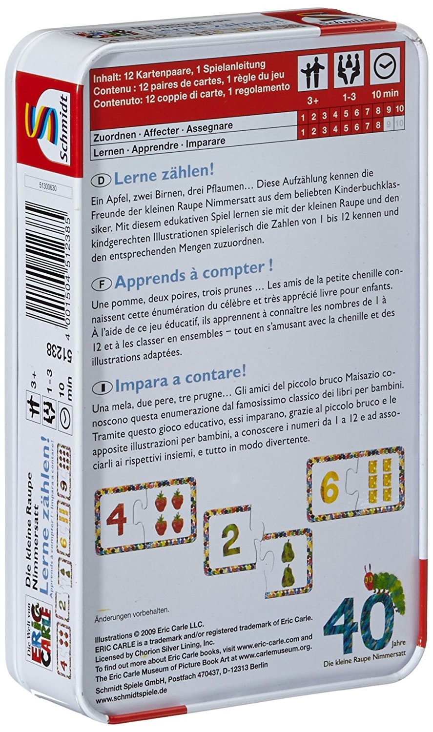 Ein Apfel, zwei Birnen, drei Pflaumen? Diese Aufzählung kennen die Freunde der kleinen Raupe Nimmersatt aus dem beliebten Kinderbuchklassiker. Mit diesem edukativen Spiel lernen sie mit der kleinen Raupe und den kindgerechten Illustrationen spielerisch die Zah...