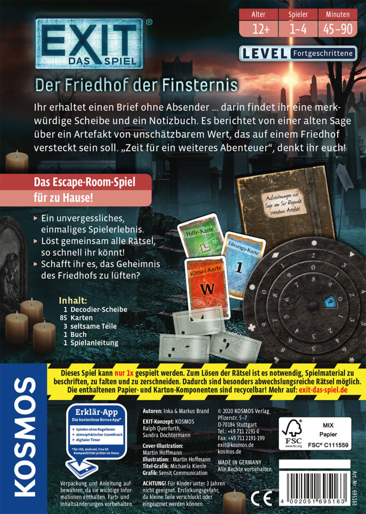 Escape-Room-Fans aufgepasst! Auf dem Friedhof der Finsternis steigen die Spieler in eine dunkle Gruft hinab, um ein sagenumwobenes Artefakt zu suchen. Das Mondlicht gibt nur für kurze Zeit das Geheimnis des Schatzes frei. Das Team muss also gut zusammenarbeite...