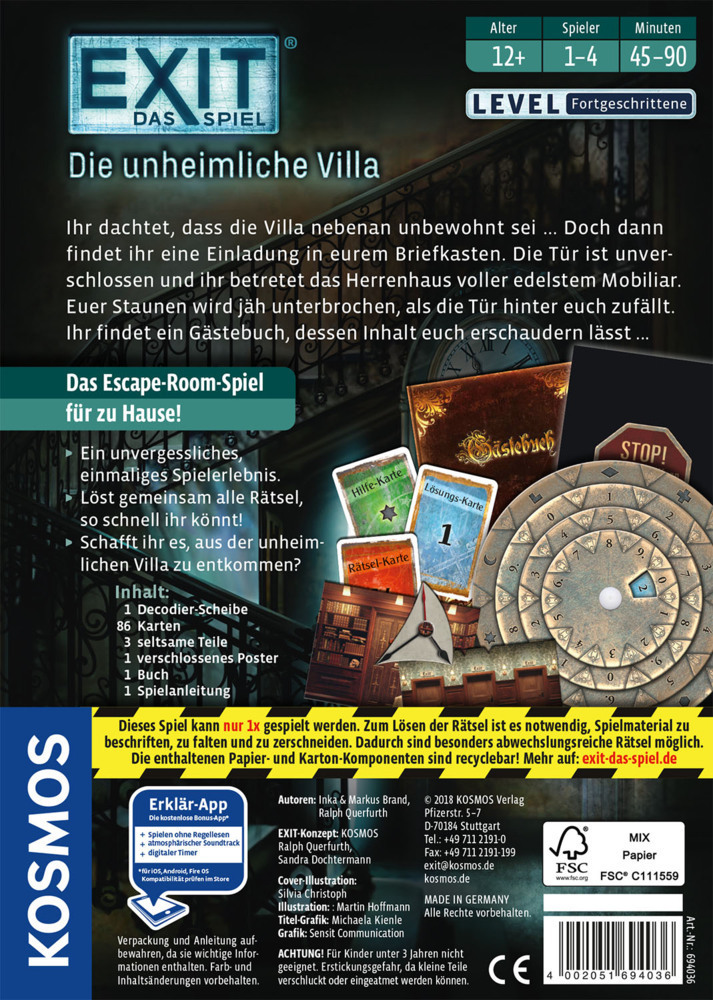 Die Spieler sind in eine Villa eingeladen. Doch nach ihrer Ankunft stellen sie fest, dass sie Teil eines makabren Spiels geworden sind. Und es bleibt nicht viel Zeit, die Rätsel zu lösen, um aus der Villa zu fliehen. Bei EXIT Das Spiel entdecken die Spieler mi...