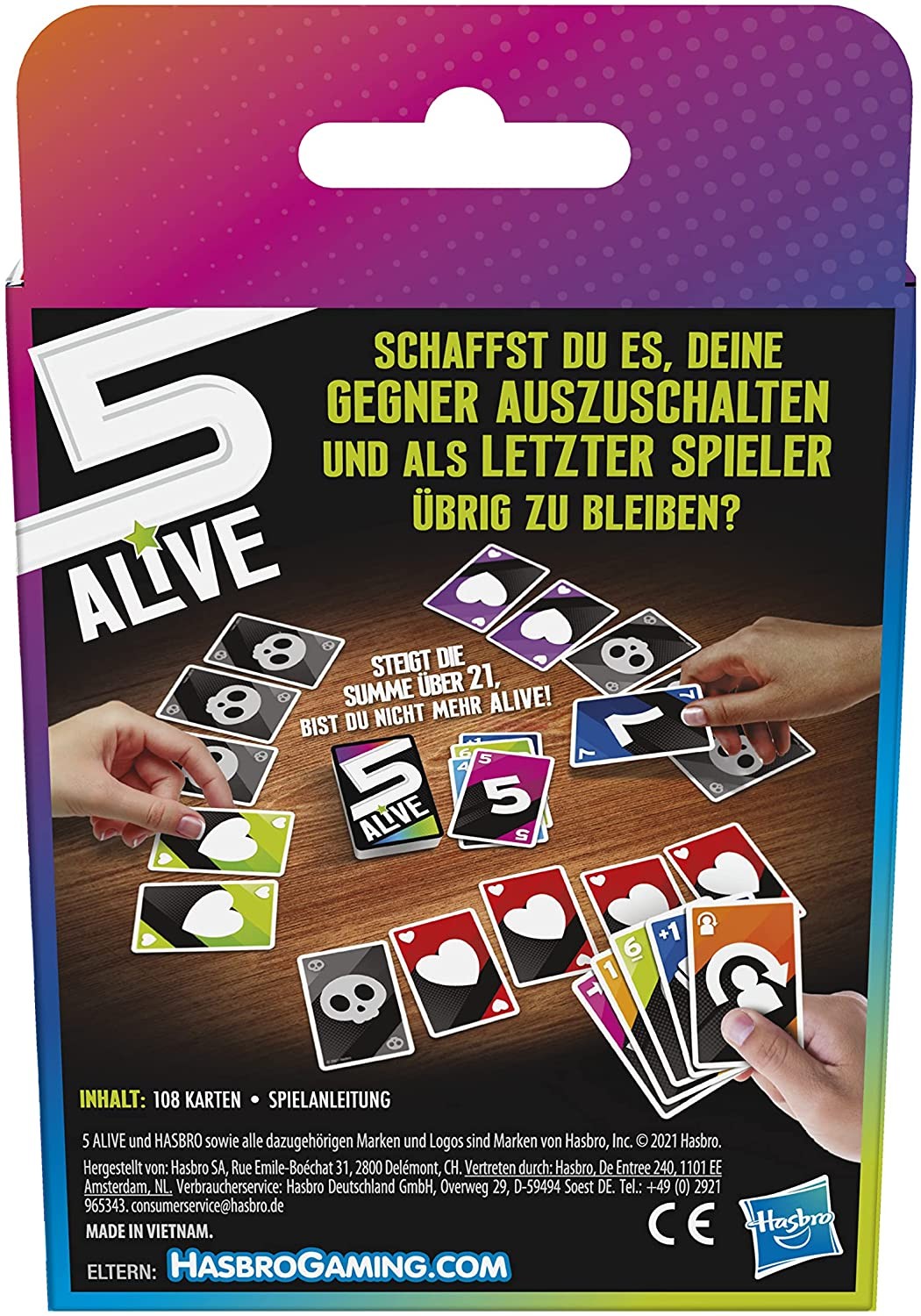 Five Alive Kartenspiel Machen Sie sich bereit für ein unvorhersehbares und rasantes Kartenspiel für die ganze Familie. Das Spiel 5 Alive ist eine spannende Abwandlung des klassischen Spiels 21, bei dem die Spieler nummerierte Karten erhalten und unter 21 bleib...