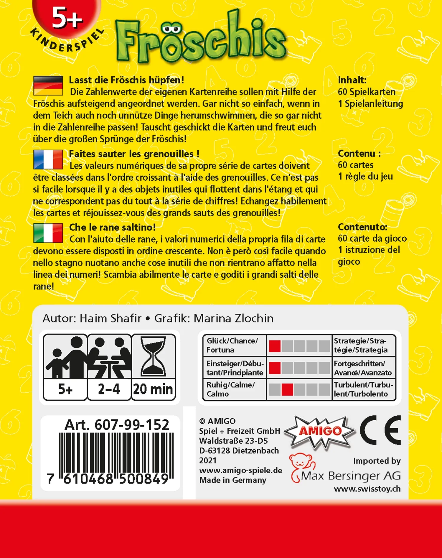 Die Zahlenwerte der eigenen Kartenreihe sollen mit Hilfe der Fröschis aufsteigend angeordnet werden. Gar nicht so einfach, wenn in dem Teich auch noch unnütze Dinge herumschwimmen, die so gar nicht in die Zahlenreihe passen!