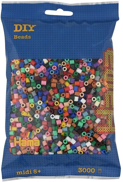 Hama® Bügelperlen Midi - Vollton Mix 3000 Perlen (22 Farben). Beutel mit 3000 HAMA-Perlen im Vollton-Mix: 22 Farben (Weiß, Creme, Gelb, Rot, Orange, Hellrot, Lila, Blau, Hellblau, Grün, Hellgrü n, Braun, Grau, Schwarz, Rotbraun, Hellbraun, Hautfarbe, Beige, Ol...