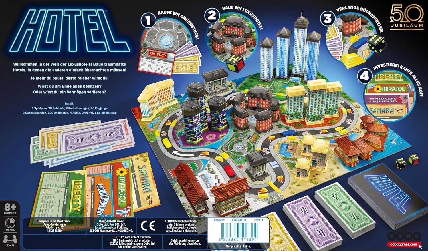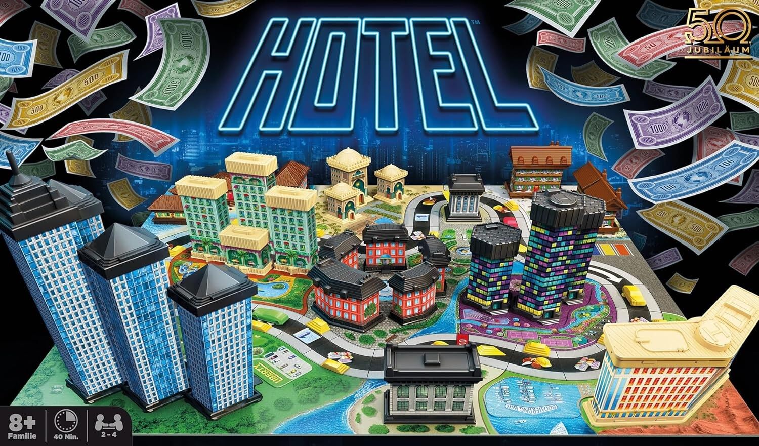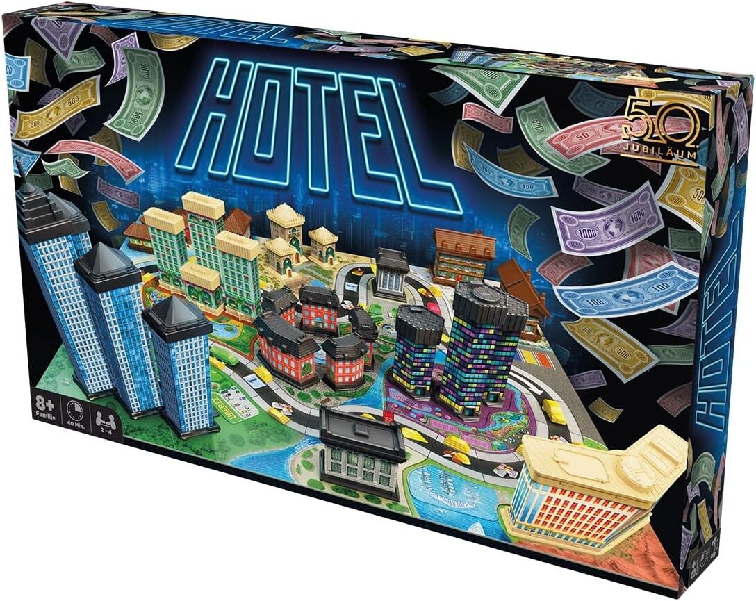 Der kultige Familienspiel-Klassiker Hotel ist zurück! Anlässlich des 50-jährigen Jubiläums erscheint die Version 2024 in schickem Retro-Design, aber mit den gleichen erbarmungslosen Regeln. Kauft euch Grundstücke, baut Luxushotels und lasst den Spielplan mit e...