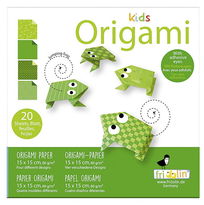 Origami-Modell: Frosch Mit lustigen Aufklebern (je nach Modell) 4 verschiedene Papier-Designs Traditionelle Faltaufgabe zur Förderung von Konzentration und Fingerfertigkeit