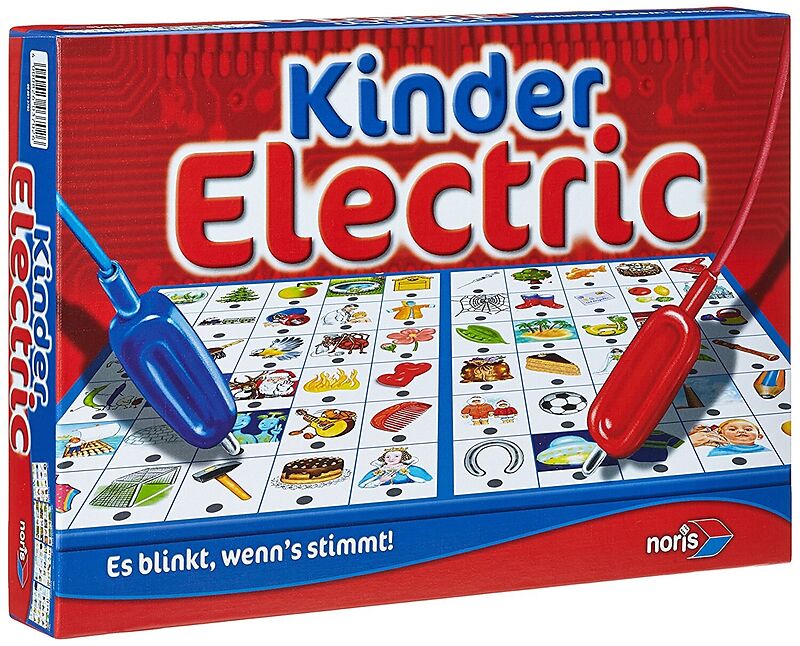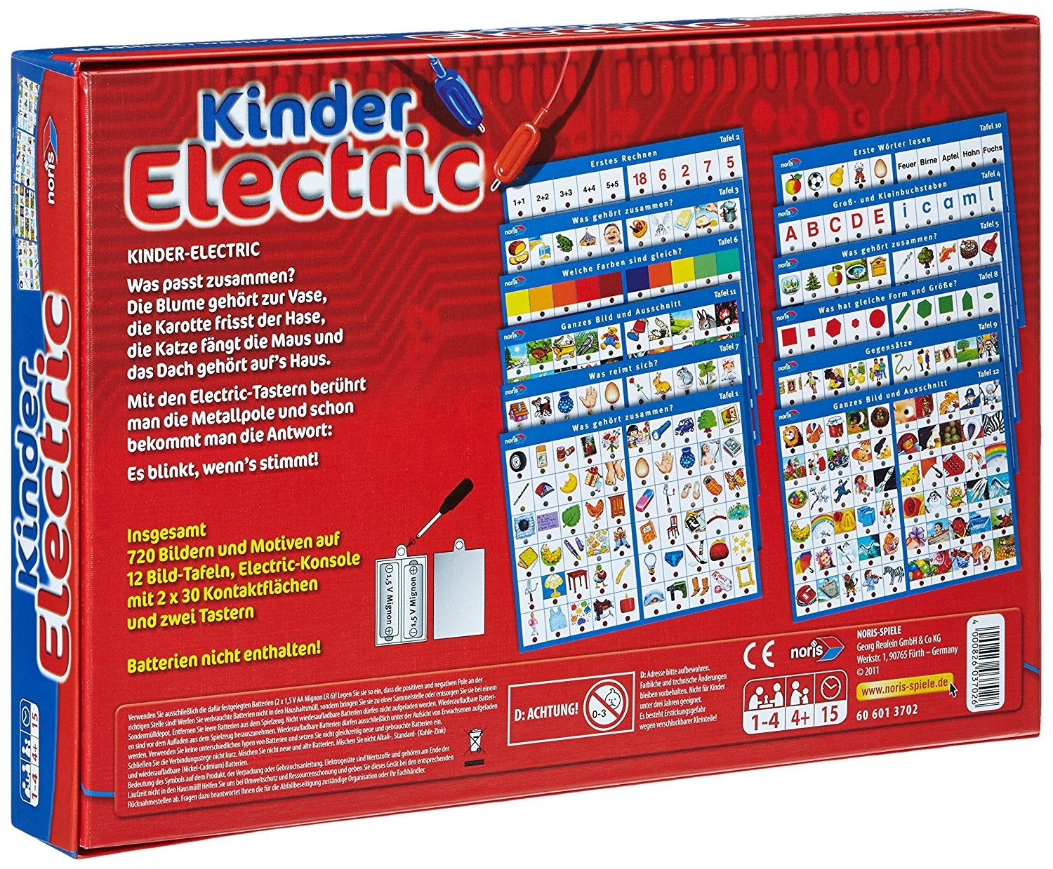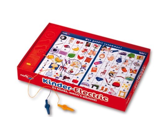 Kinder Electric Es blinkt - wenn's stimmt! Eine der unterschiedlichen Aufgaben-Karten wird auf das Spielbrett-Modul gelegt. Unter jedem Bild befindet sich eine elektrische Kontaktfläche. Es geht darum, zu einem Bild der rechten Hälfte ein passendes Bild der li...
