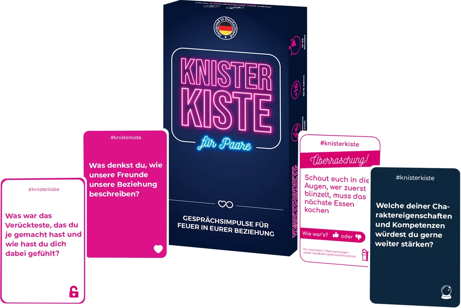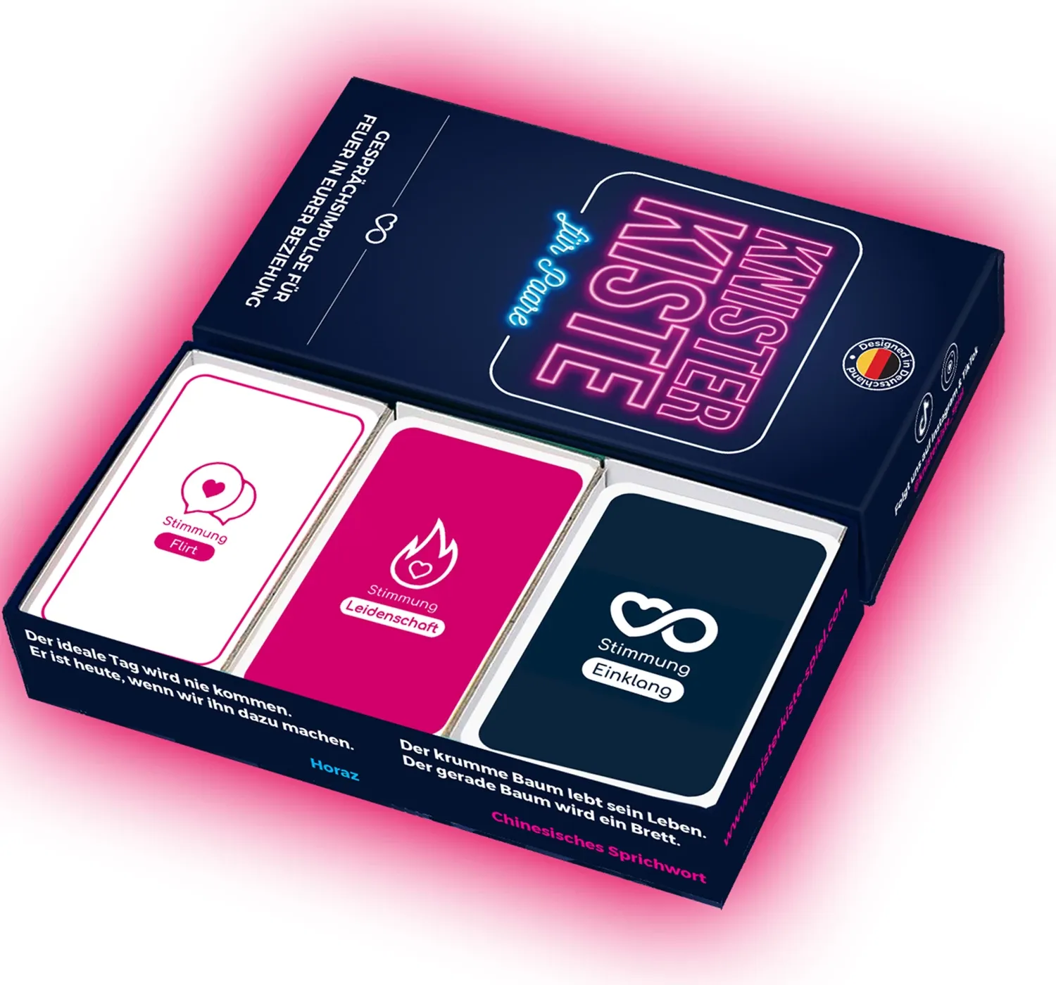 Gesprächsimpulse für Feuer in eurer Beziehung! Plant ein schönes Date und wählt aus 3 verschiedenen Stimmungen (Flirt, Leidenschaft und Einklang). Stellt euch die Fragen gegenseitig und lasst dem Gesprächsfluss freien Lauf.
