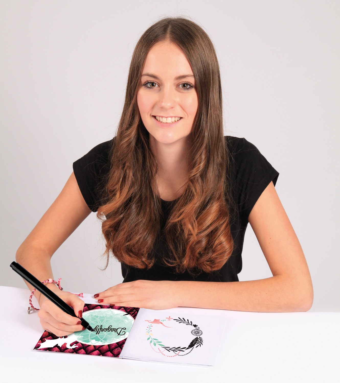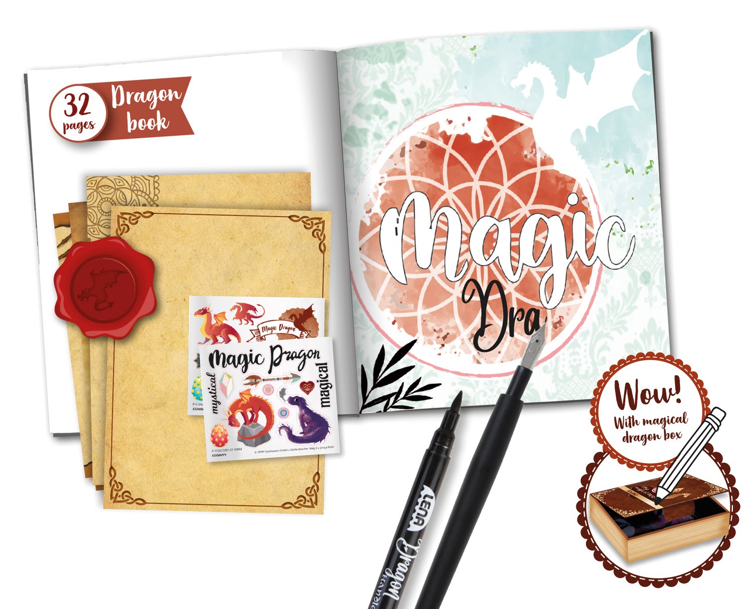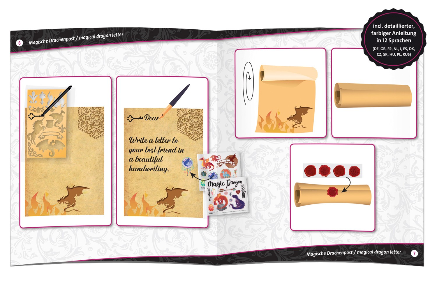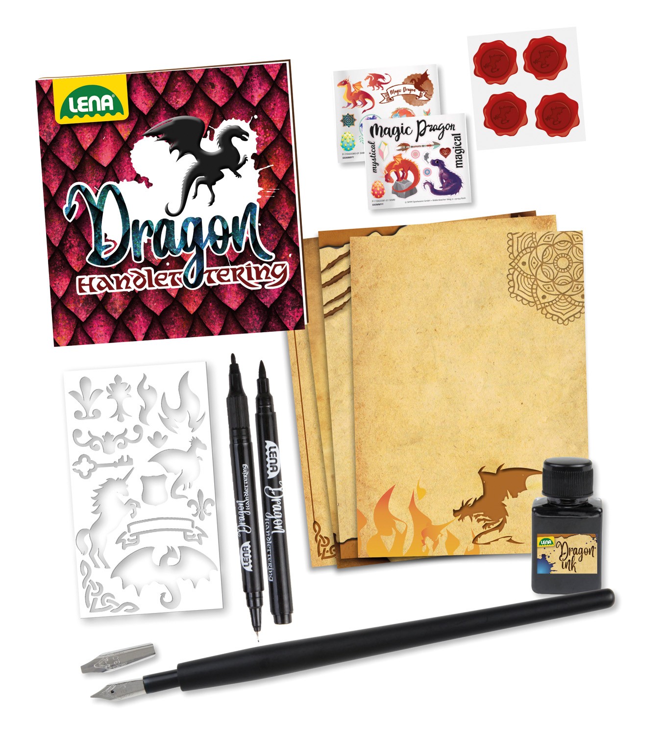 LENA Dragon Handlettering - Briefpapier und Heft im Drachenlook. Handlettering- und Kalligraphie-Set zum selbst Gestalten. Enthält 2 schwarze Stifte, einer davon mit 2 Spitzen, 1 Kalligraphie Feder inkl. Tintenfass und Wechselspitze, 1 Schablone, Heft mit Drac...