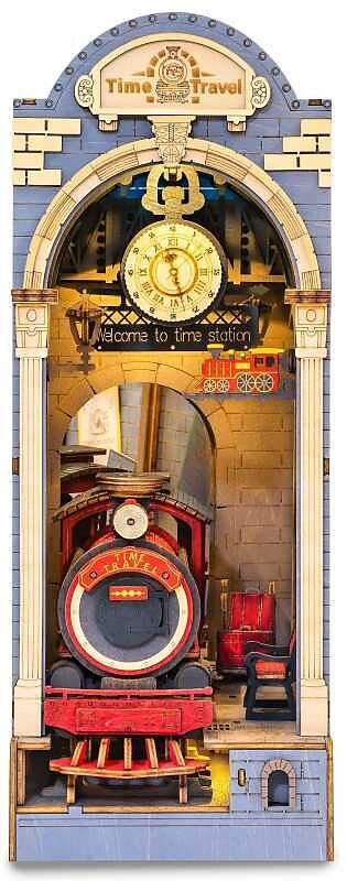 Ein Bahnhof mit unzähligem Zubehör, als Bücherstütze geeignet, LED- Beleuchtung, riesiger Bastelspass, Alter 14+, aufgebaut 18,4 x 9,8 x 25 cm, 258 Holzteile,